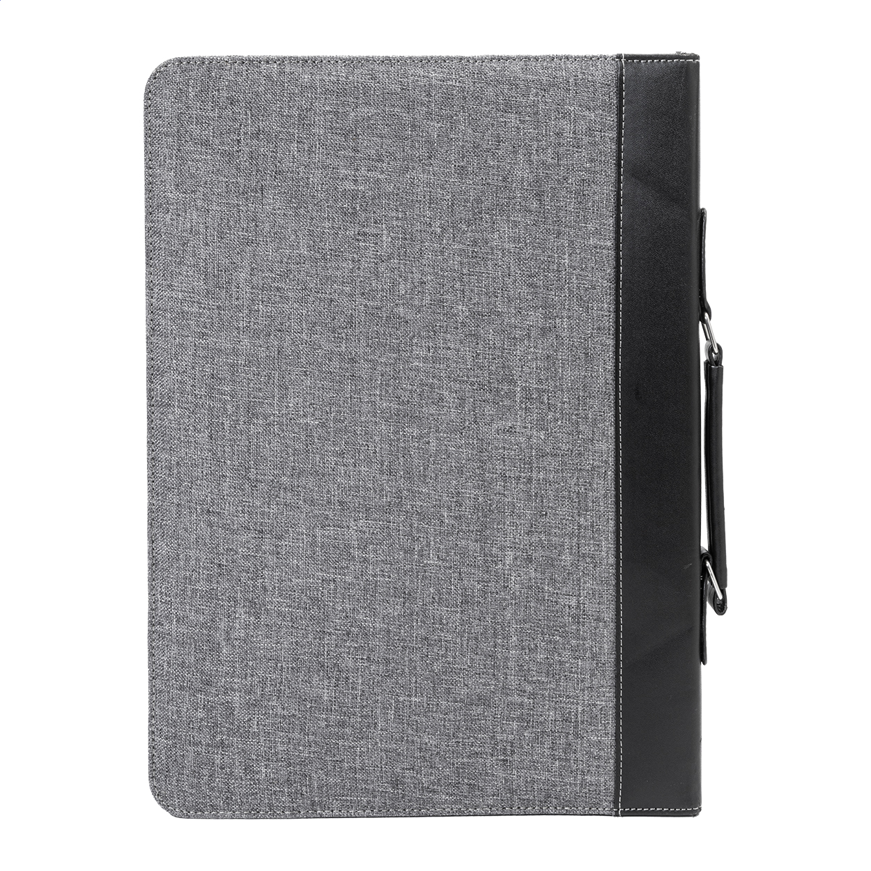 Zapinana teczka na dokumenty z rączką, A4, pokryta tkaniną lnianą i skórą PU. Zawiera notatnik z 20 kartkami w linie, kalkulator na baterie słoneczne i metalową blaszkę.