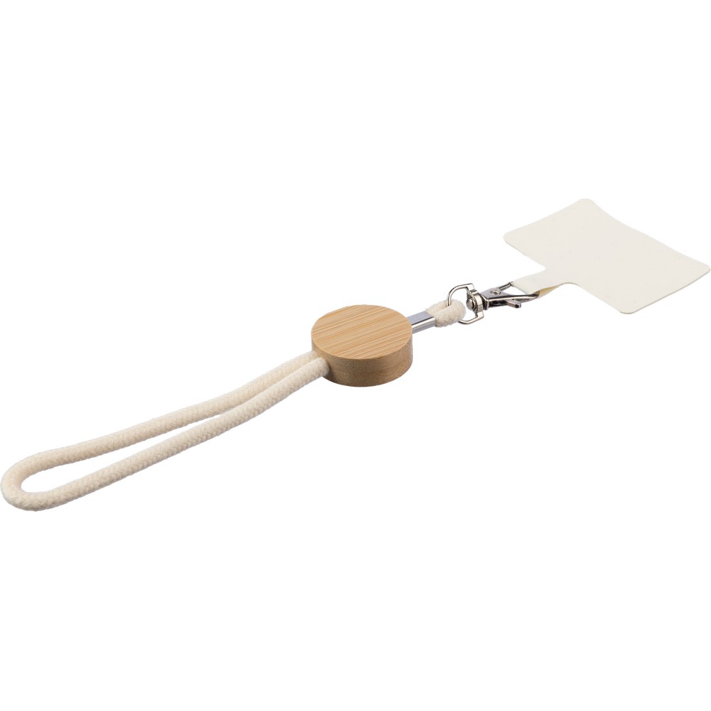 Smycz na telefon z metalowym karabińczykiem ułatwiającym przypięcie, zawiera okrągły element z bambusa, produkt wykonany z bawełny
