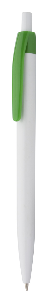 Plastikowy długopis z białym korpusem i kolorowym klipsem, w zestawie z niebieskim wkładem.