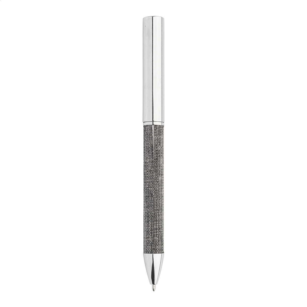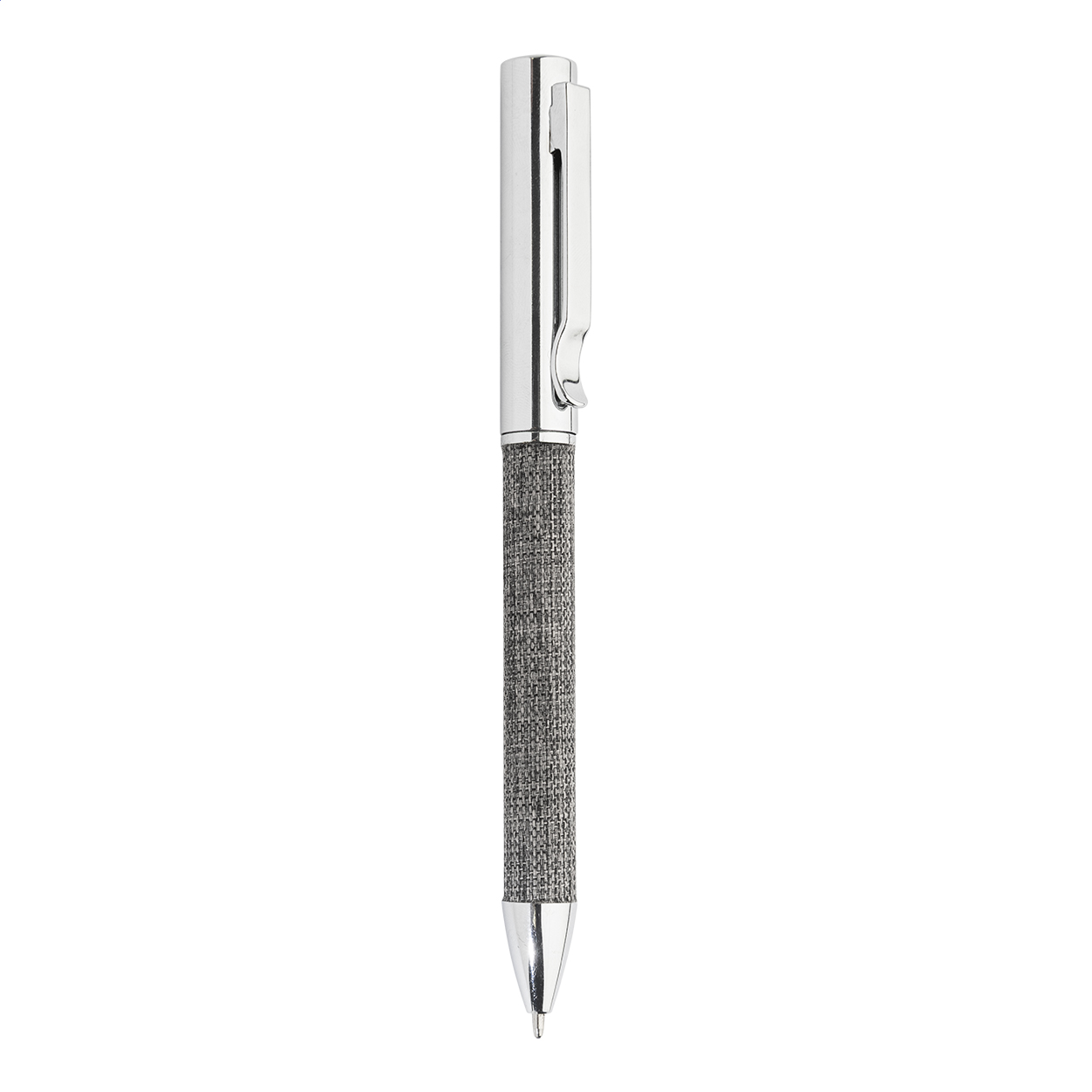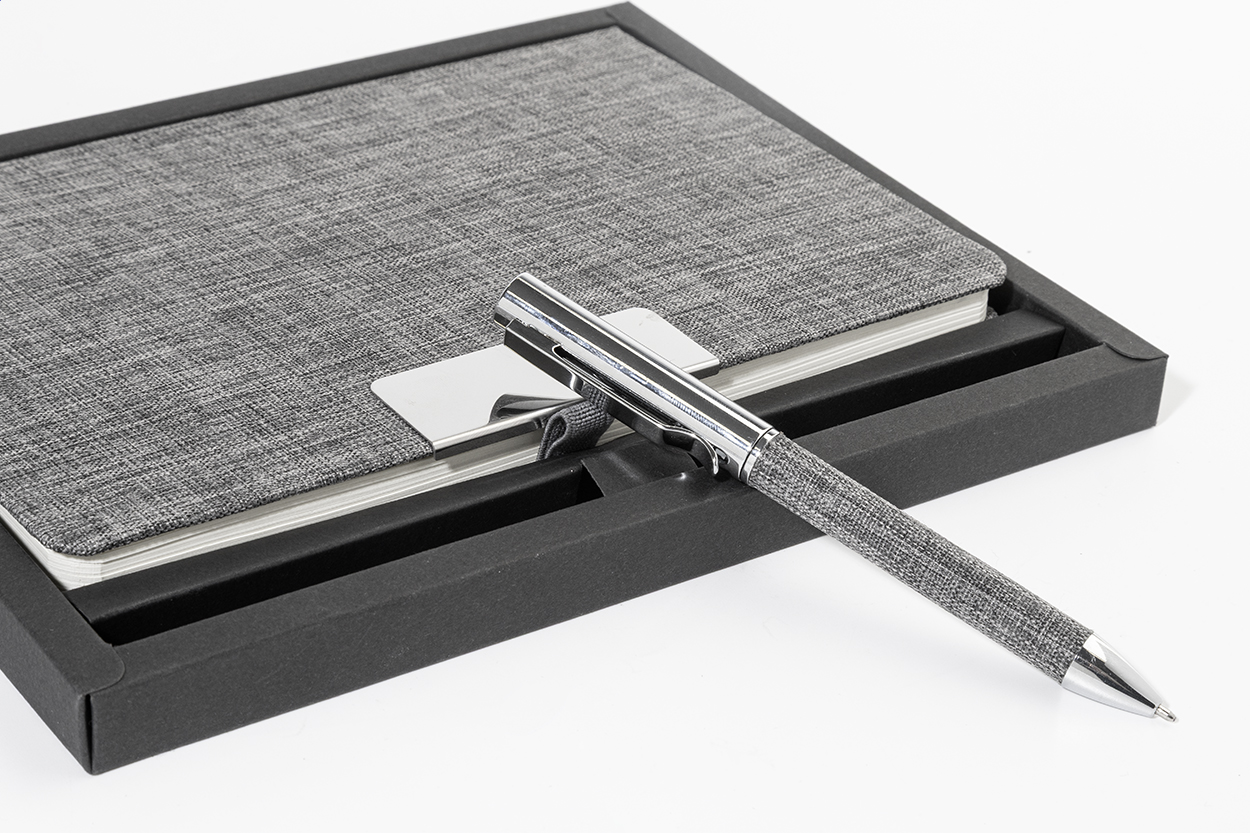 Notatnik pokryty poliestrem 300D RPET ze 100 kartkami w linie i gumowym paskiem. Zawiera metalowy długopis pokryty poliestrem RPET, z niebieskim wkładem. Rozmiar A5.