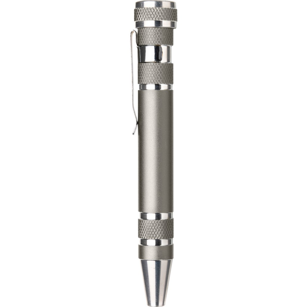 Śrubokręt w kształcie długopisu z 4 płaskimi i 4 krzyżakowymi końcówkami, posiada klip umożliwiający przypinanie, produkt wykonany z aluminium i stali