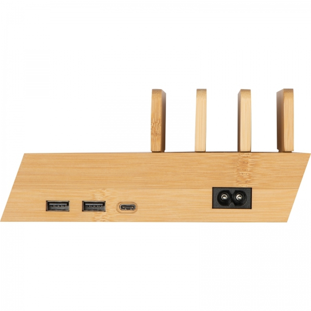 Indukcyjna stacja ładująca z miejscem na 4 urządzenia. Ładowarka wyposażona w 2 porty USB i 1 port typu C. Kabel do ładowania dołączony.
