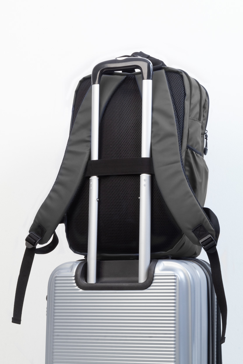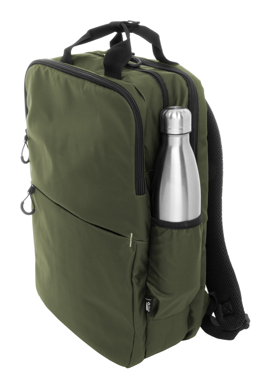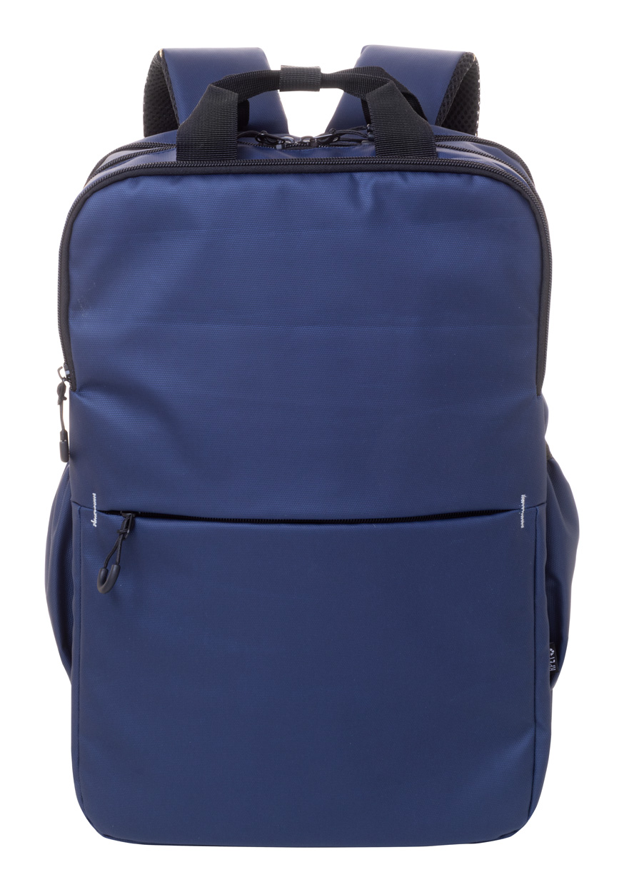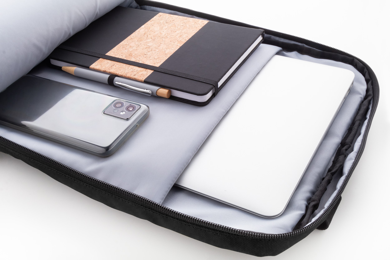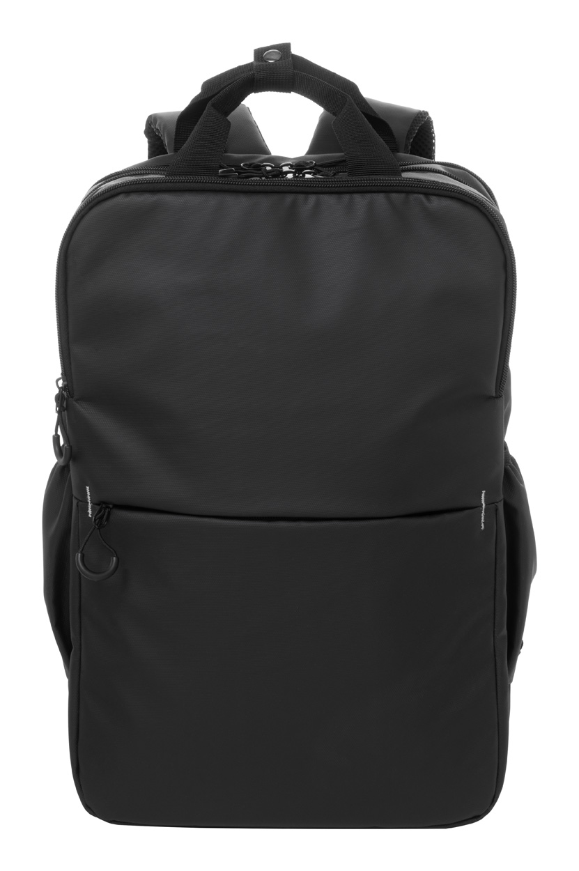 Wodoodporny plecak RPET z 2 przegrodami zapinanymi na zamek, 2 kieszeniami przednimi zapinanymi na zamek, kieszeniami bocznymi i wyściełaną przegrodą na laptopa (16″). Z paskiem do walizki, wyściełanymi plecami i paskami naramiennymi. Poliester 600D RPET pokryty PU, z charakterystyczną metką RPET.
