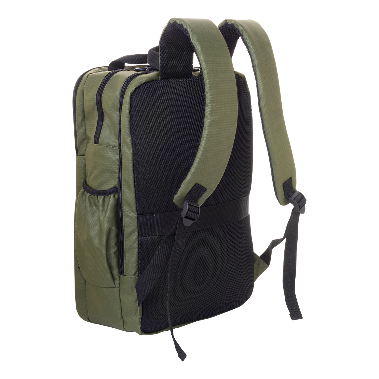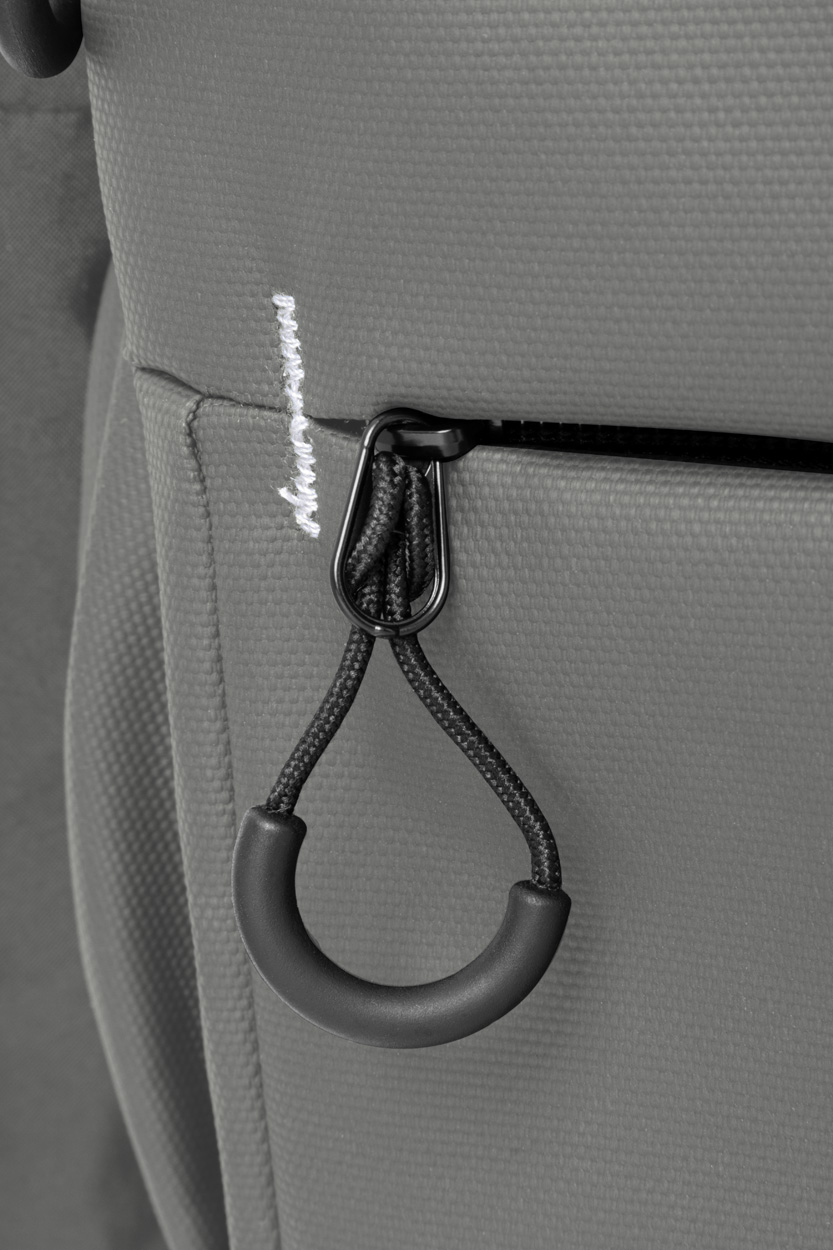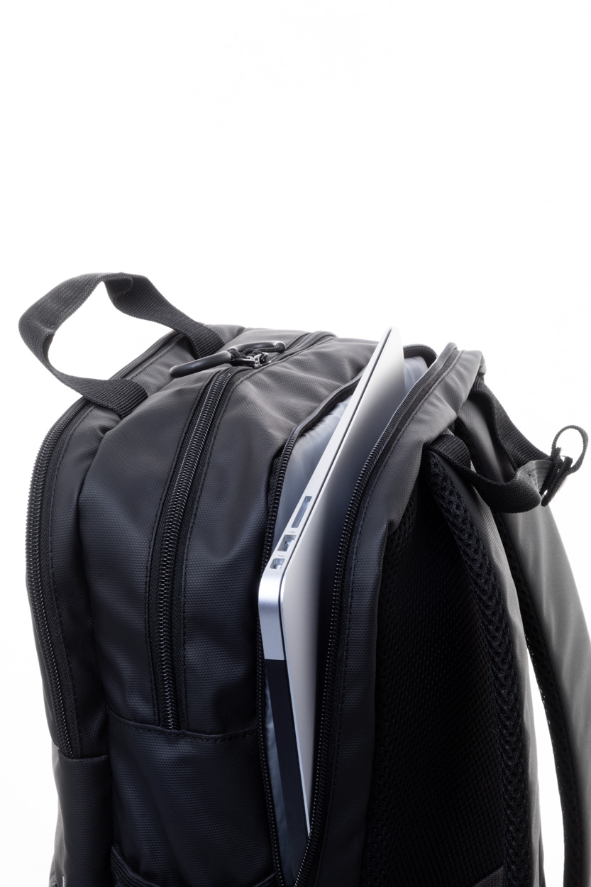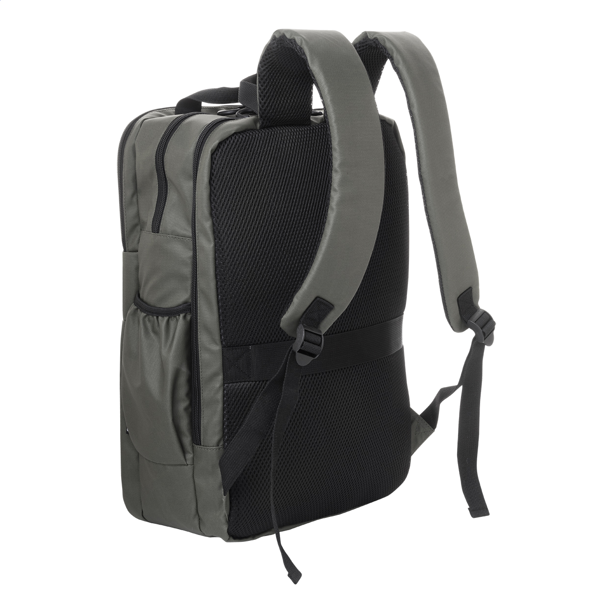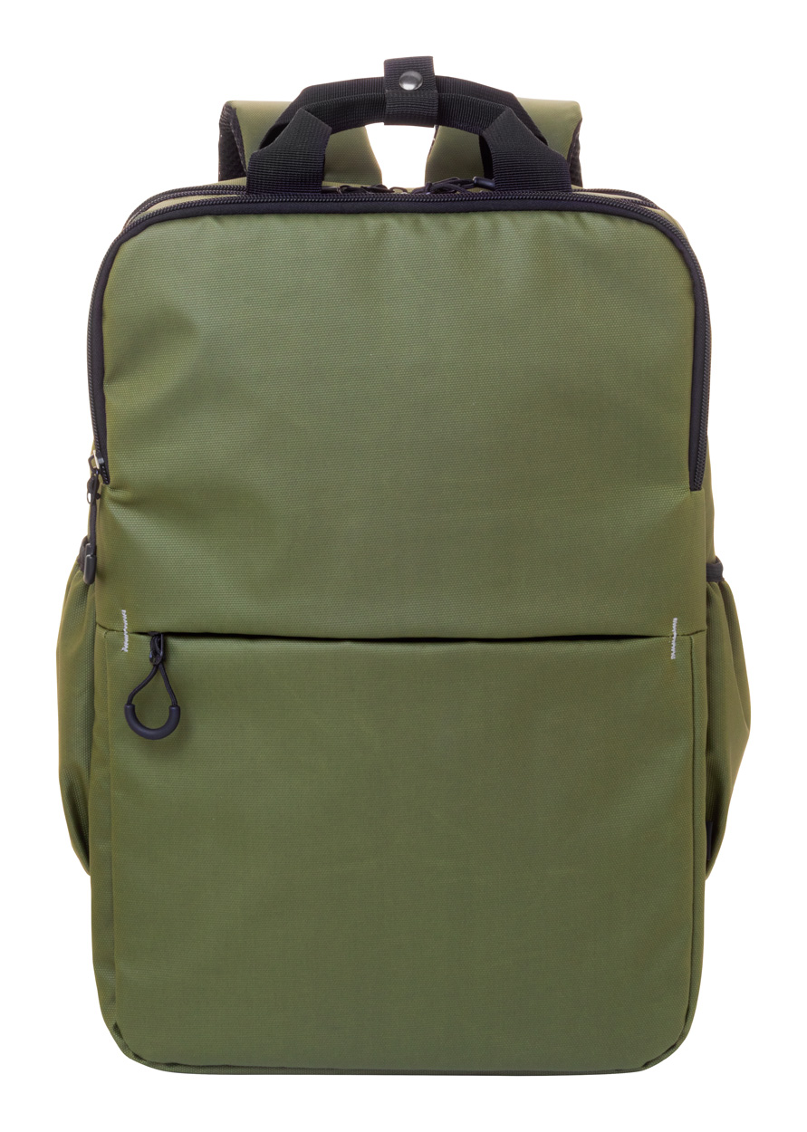 Wodoodporny plecak RPET z 2 przegrodami zapinanymi na zamek, 2 kieszeniami przednimi zapinanymi na zamek, kieszeniami bocznymi i wyściełaną przegrodą na laptopa (16″). Z paskiem do walizki, wyściełanymi plecami i paskami naramiennymi. Poliester 600D RPET pokryty PU, z charakterystyczną metką RPET.