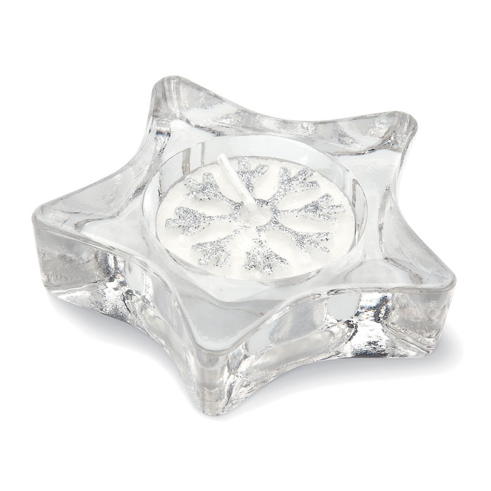 Szklany świecznik w kształcie gwiazdki, zapakowany w srebrny kartonik z przeźroczystym wieczkiem i wstążeczką.