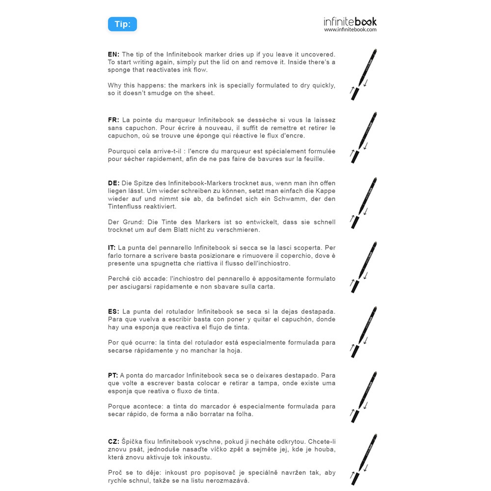 Zestaw startowy „Infinitebook” A5 pozwala łatwo wymazać wszystko, co napiszesz, i zacząć od nowa tyle razy, ile chcesz. Zawiera on „Infinitebook” z twardą okładką i ringami, 1 zestaw do czyszczenia (pusta butelka z rozpylaczem, gąbka i 1 ściereczka), 1 marker i 1 uchwyt na długopis. Notatki mogą zostać zdigitalizowane. Wyprodukowano w Europie. Produkty są dostarczane w pudełku