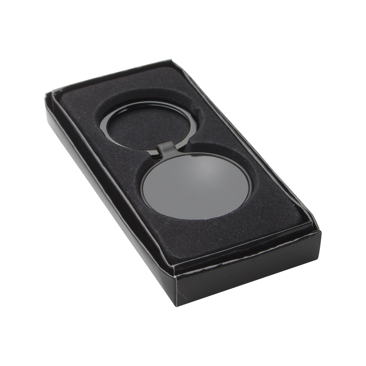 Okrągły, metalowy brelok z metalicznym wykończeniem.