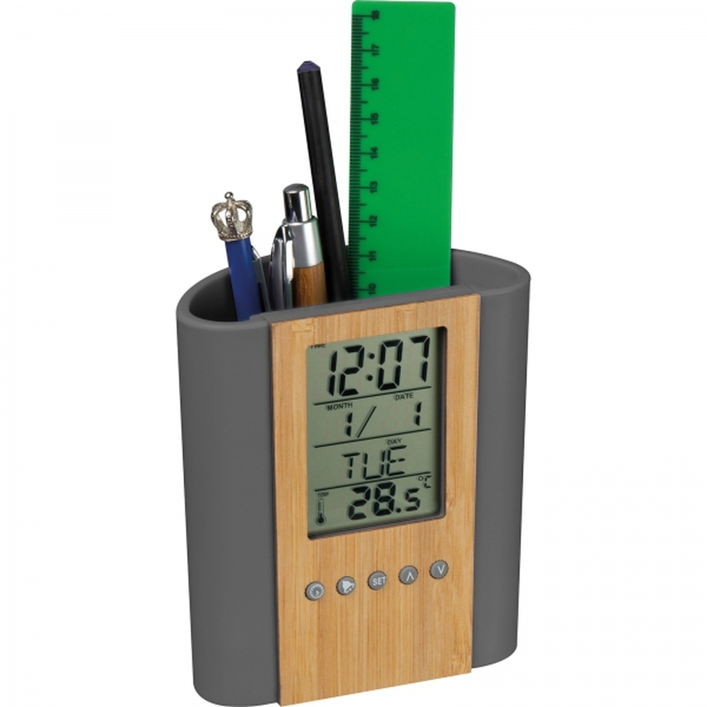 Stojak biurkowy na długopisy z bambusowym frontem i wbudowanym zegarem elektronicznym, posiadającym wiele funkcji, takich jak: zegar, minutnik, budzik, kalendarz, termometr oraz przypominanie o urodzinach.