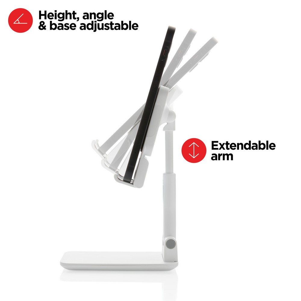 Stojak na telefon, tablet, wykonany z ABS, regulowana wysokość, silikonowy element chroniący przed zarysowaniem w którym można umieścić ładowarkę Magsafe, ciężka podstawa i silikonowe paski zapewniają stabilność, ślad węglowy produktu: 1,03 kg CO2
