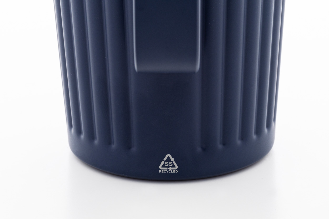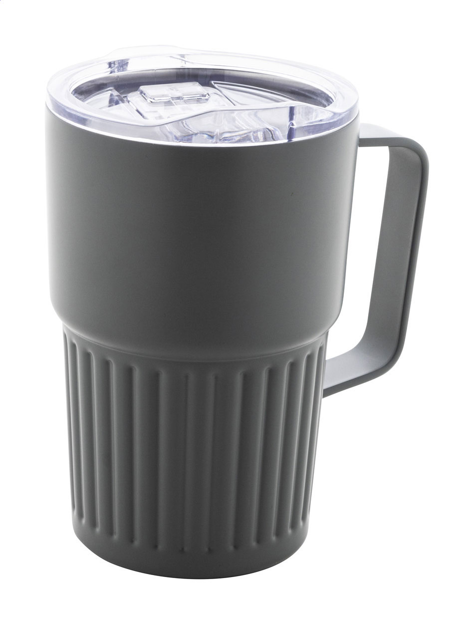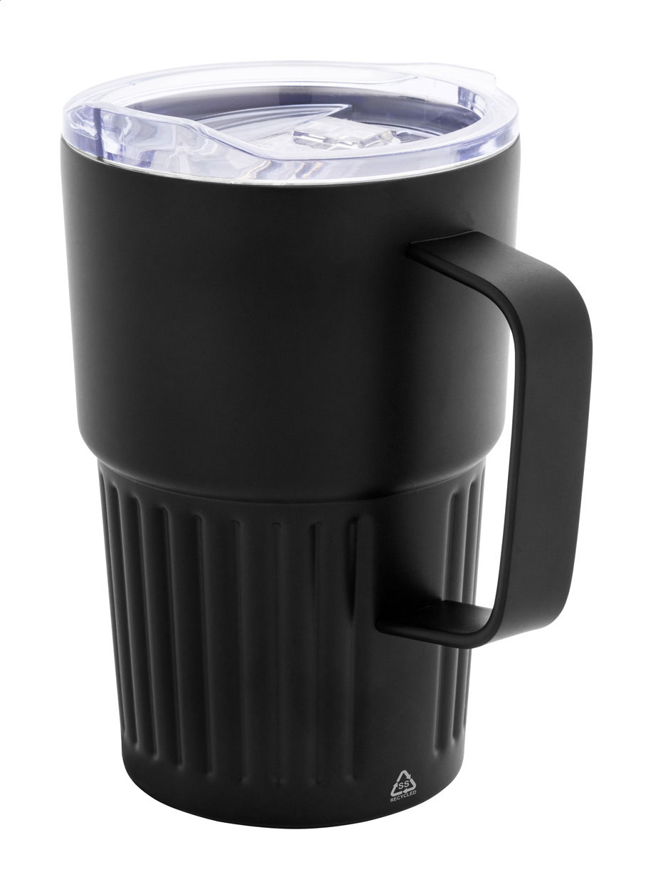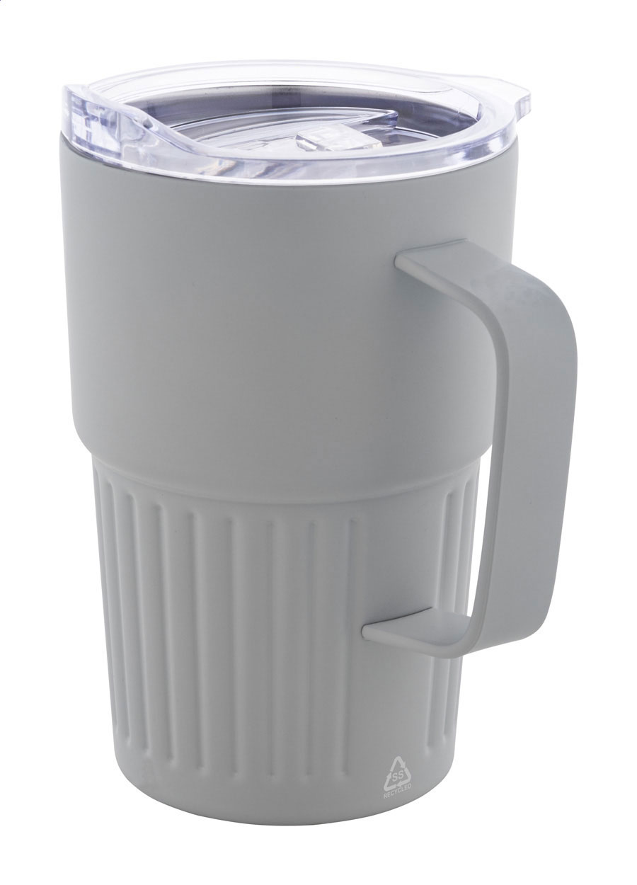 Izolowany kubek termiczny z podwójnymi ściankami, wykonany ze stali nierdzewnej z recyklingu, z pokrywką z tworzywa ABS. Pojemność 470 ml.