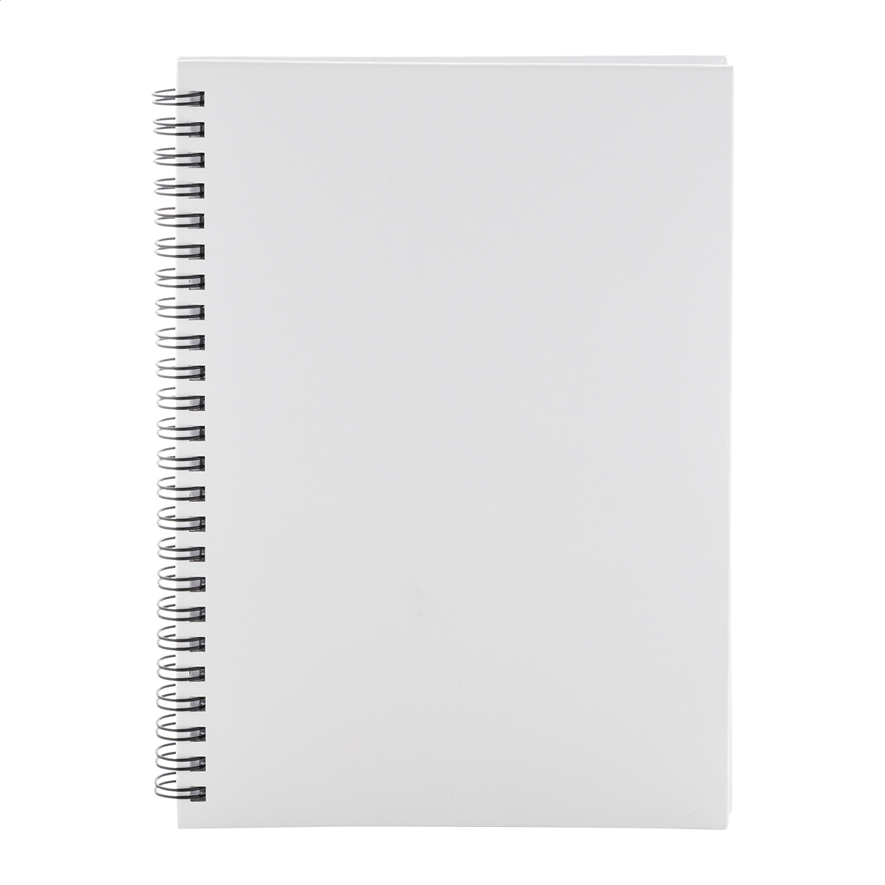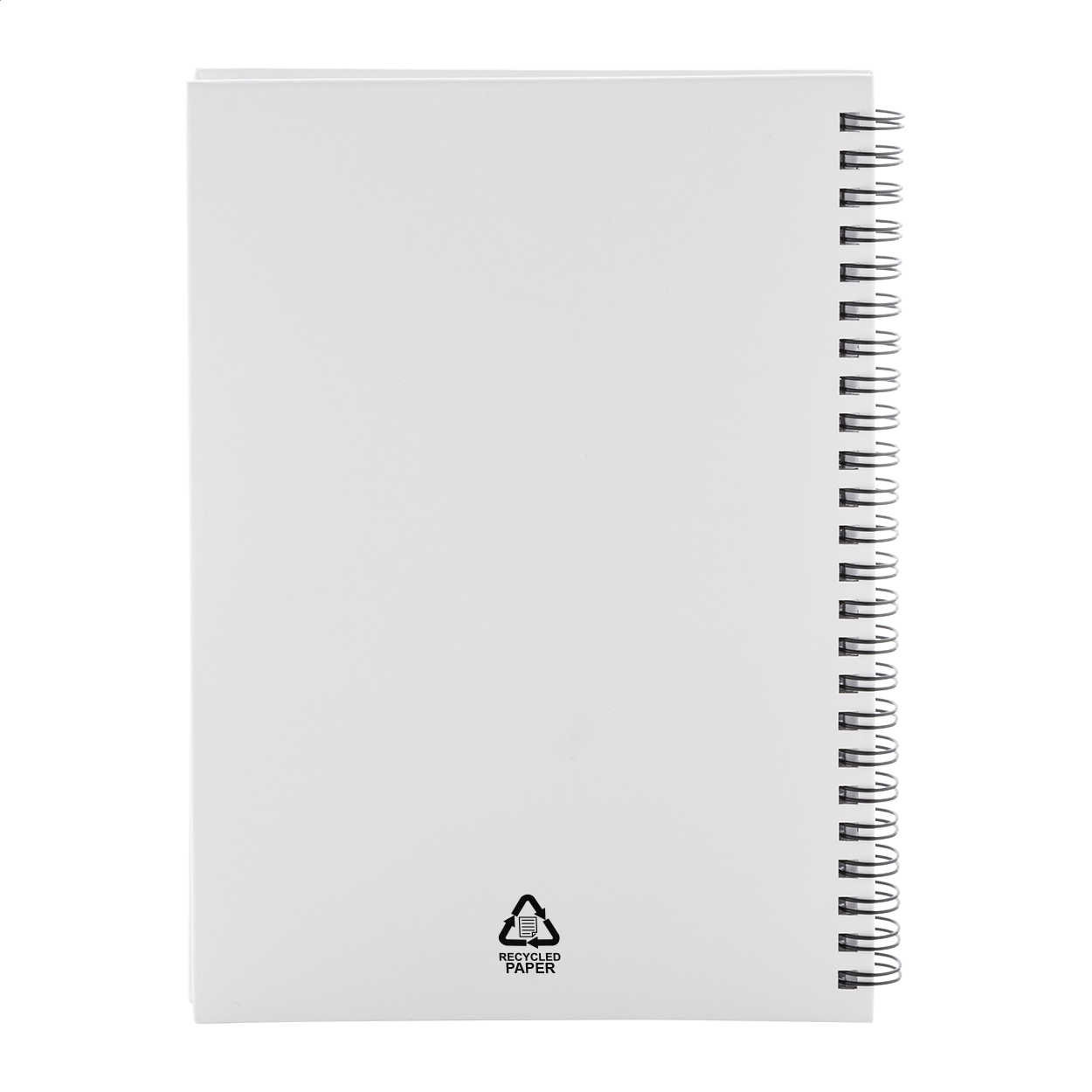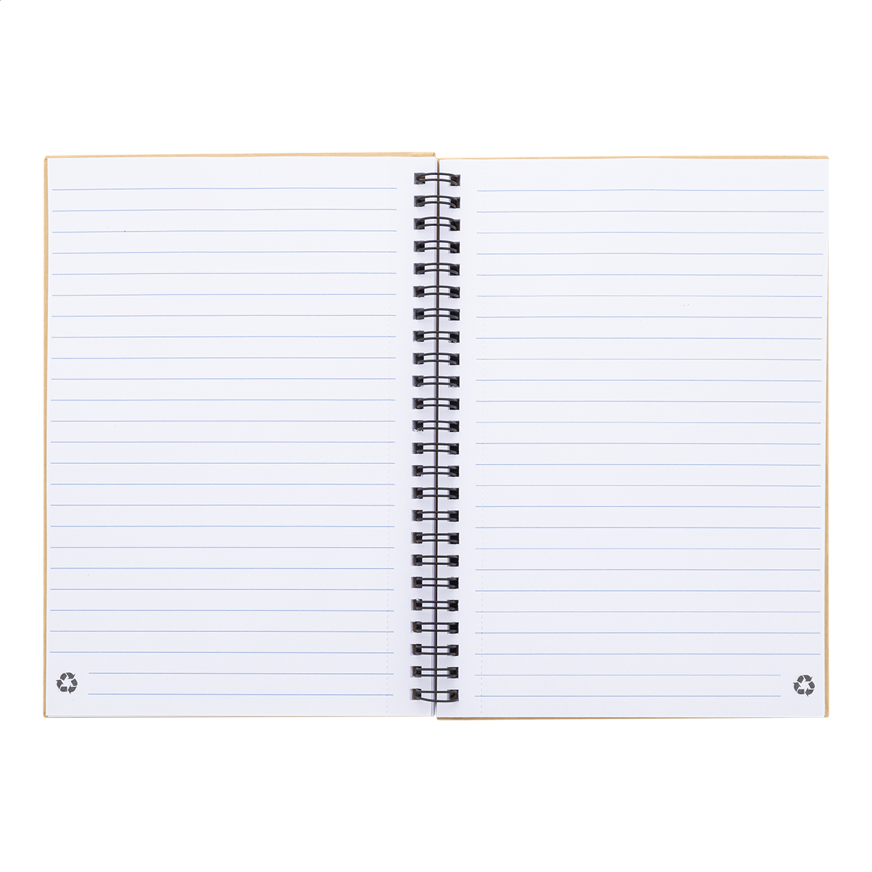 Spiralny notes w oprawie z papieru z recyklingu, zawierający 80 kartek w linie z papieru z recyklingu. Format A5.