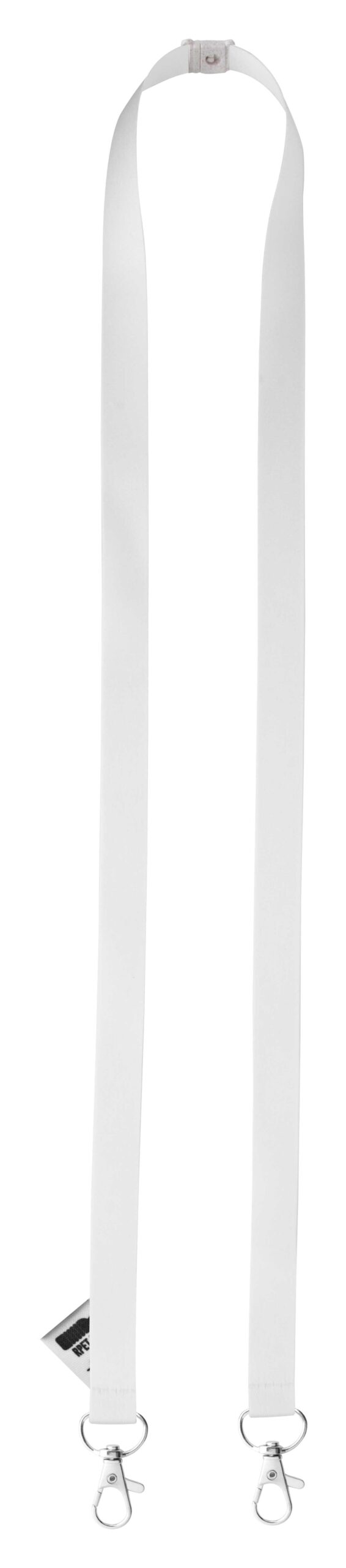 Personalizowana smycz 15mm z RPET z dwoma metalowymi karabińczykami i klamrą bezpieczeństwa z plastiku ze słomy pszenicznej. Z sublimacją po ubu stronach. Min. ilość: 100szt.
