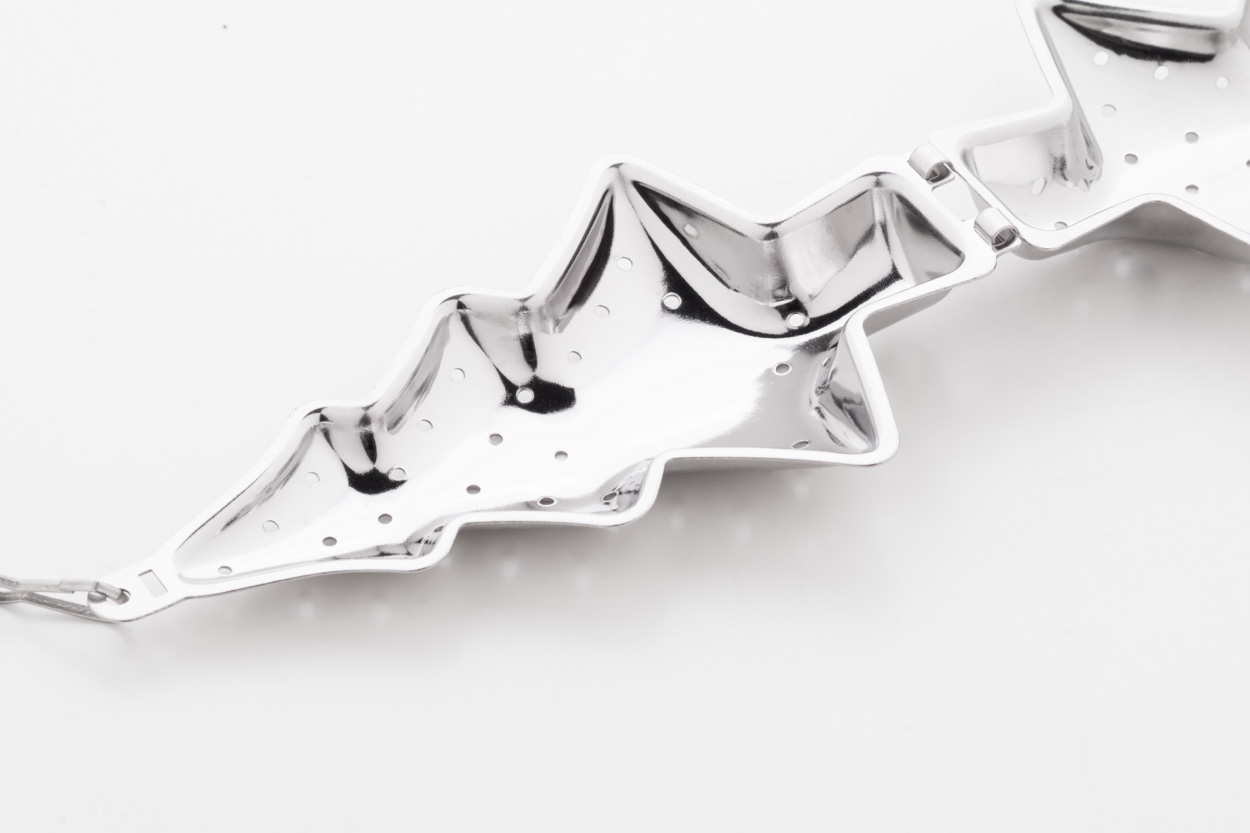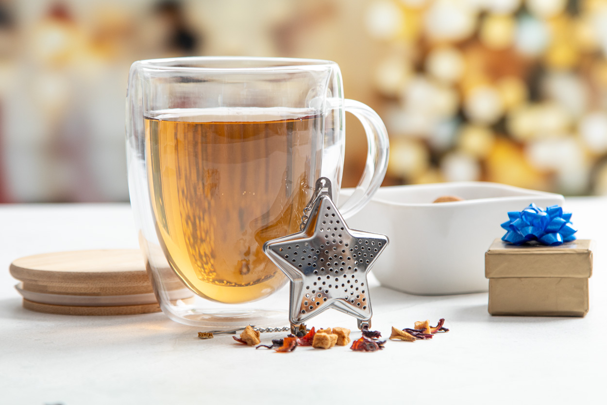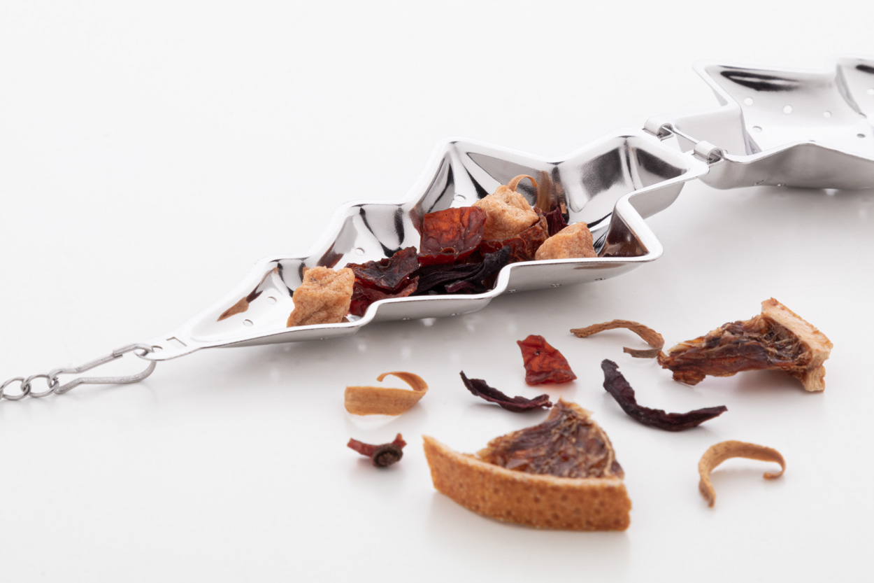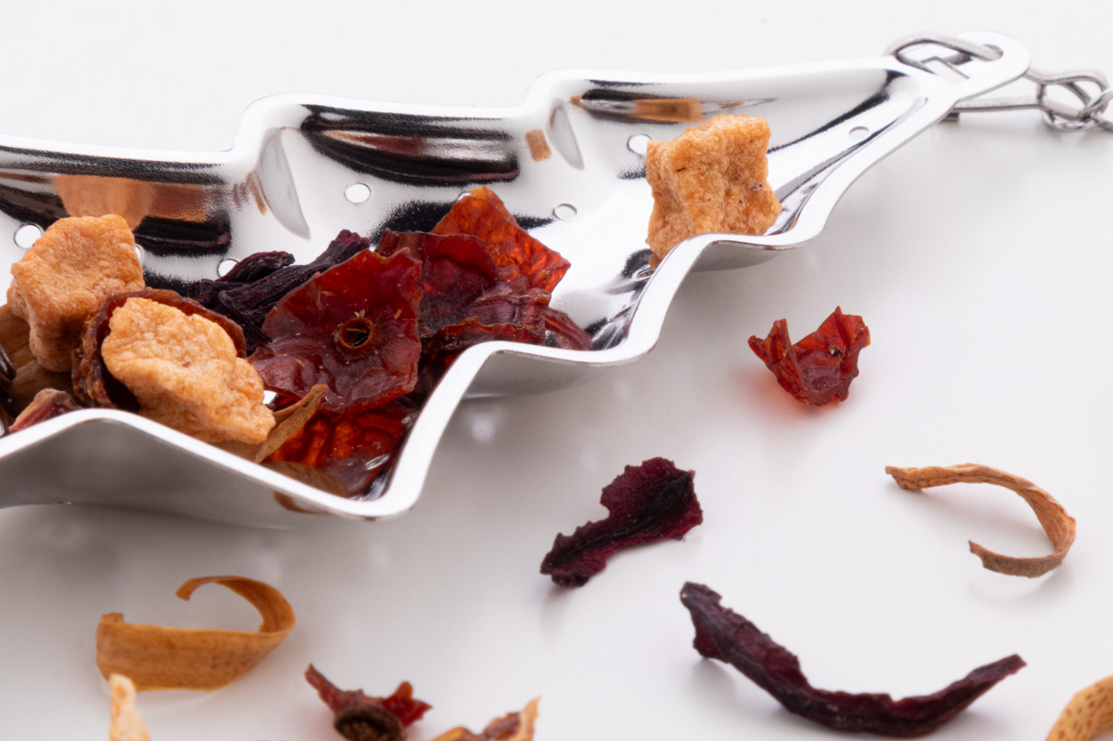 Świąteczny zaparzacz do herbaty ze stali nierdzewnej z łańcuszkiem i klipsem. Z obszarem do zadrukowania po jednej stronie.