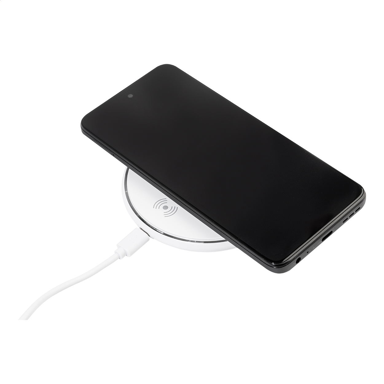 Indukcyjna szybka ładowarka (15W) w plastikowej obudowie. W zestawie kabel do ładowarki USB.
