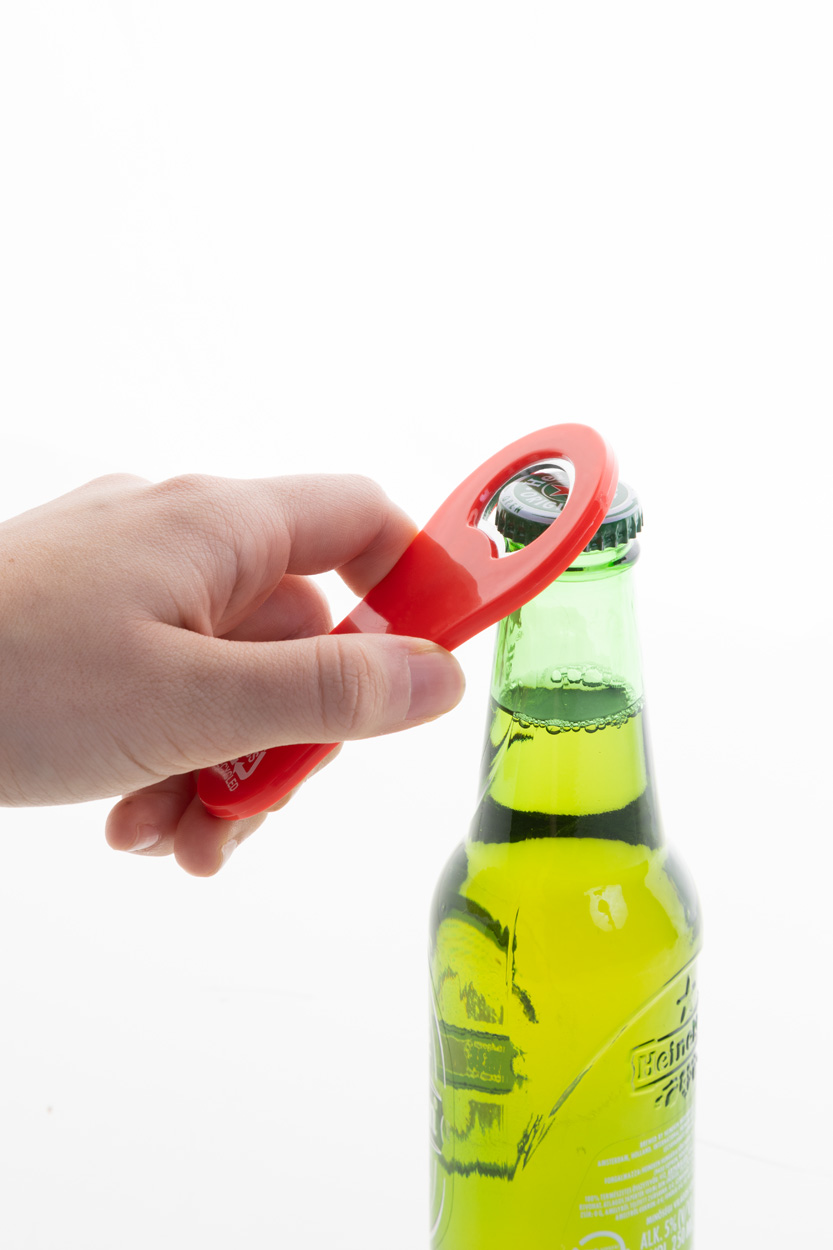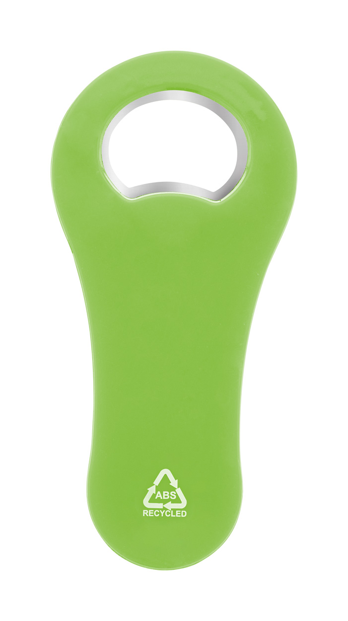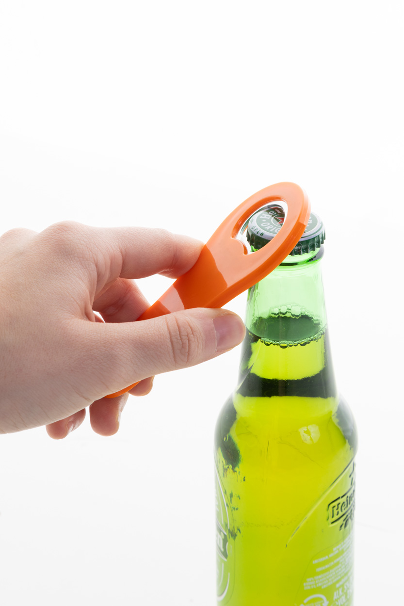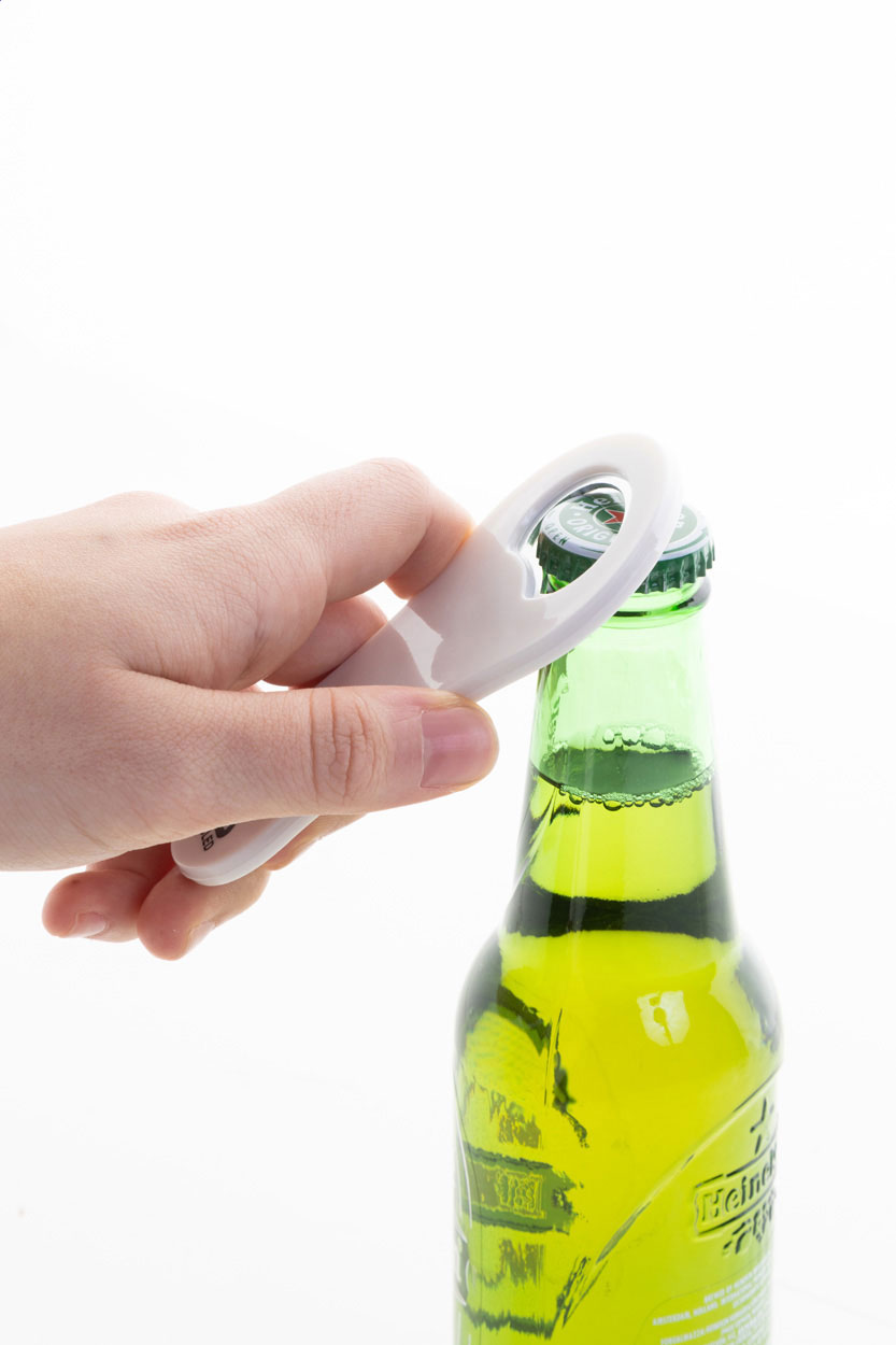 Otwieracz do butelek wykonany z recyklingowanego plastiku ABS z magnesem na lodówkę.