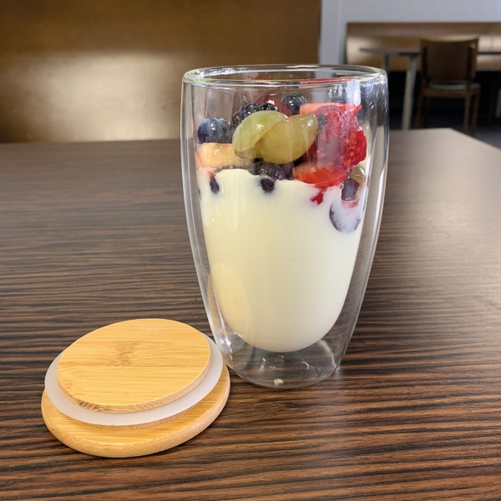 Szklanka z podwójnymi ściankami, wykonana ze szkła, o pojemności 500 ml, z bambusowym wieczkiem.