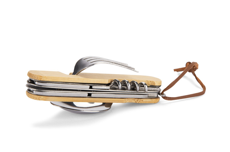 Sztućce turystyczne KENTO to wszechstronny zestaw idealny na wypady outdoorowe, wyposażony w nóż, widelec, łyżkę, korkociąg, otwieracz do butelek oraz śrubokręt. Funkcjonalność 6 w 1 pozwala zaoszczędzić miejsce i sprawdza się w każdej sytuacji w terenie. Oprawa z naturalnego bambusa nadaje zestawowi ekologiczny wygląd i zapewnia lekkość oraz trwałość. Dzięki dołączonemu rzemykowi sztućce można wygodnie przypiąć do plecaka lub paska. KENTO to doskonały wybór dla miłośników przygód i praktycznych rozwiązań.