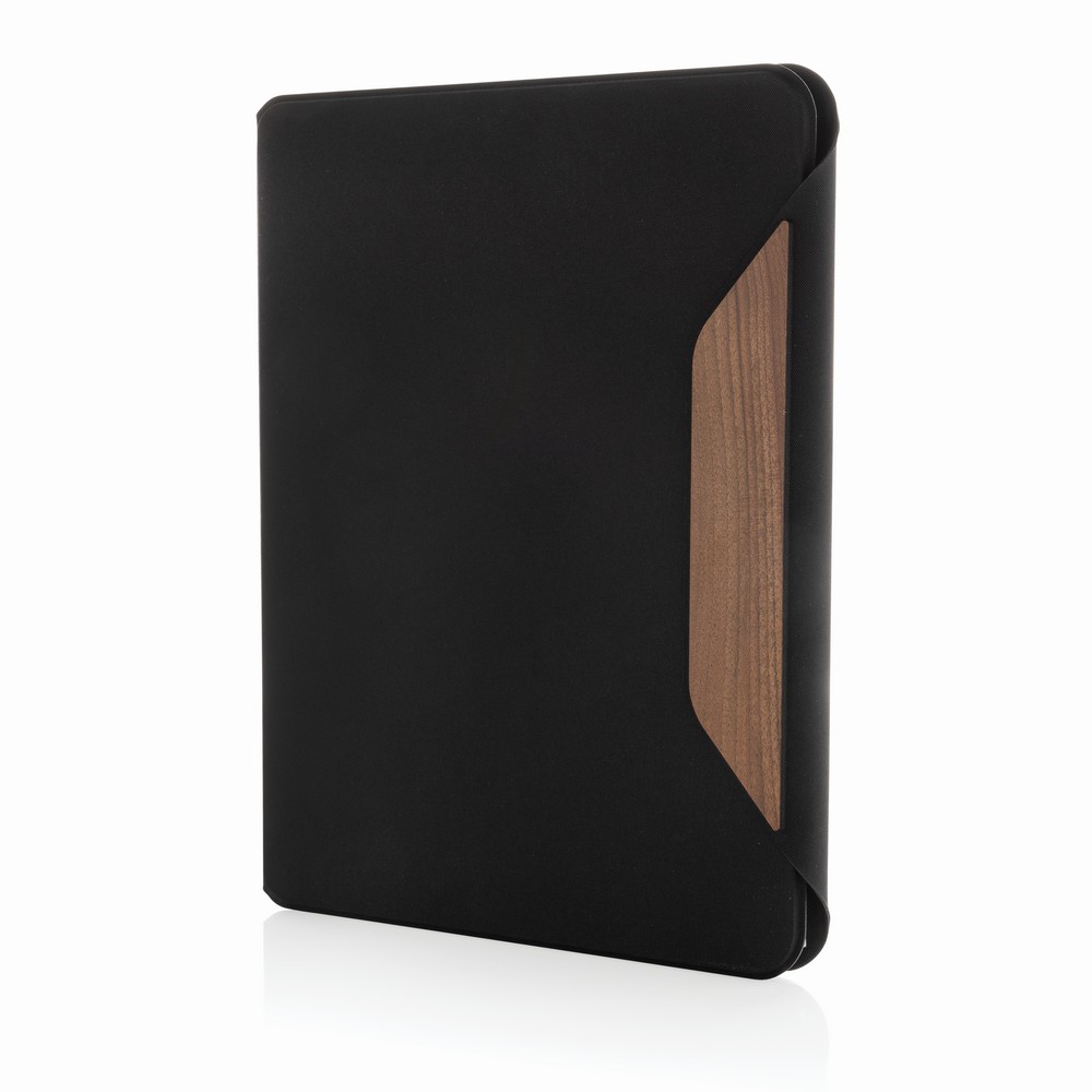 Teczka konferencyjna A4 AWARE™ RPET Teri, wykonana z recyklingowanego poliestru RPET z certyfikatem AWARE™, magnetyczne zamknięcie, emblemat z drewna orzechowego, wewnątrz 4 miejsca na wizytówki, kieszeń na dokumenty A4, notatnik A4 z papieru FSC® mix, 30 kremowych kartek w linie (70 g/m²), opakowanie prezentowe FSC® mix, bez PVC, 2% dochodu przeznaczone na Water.org