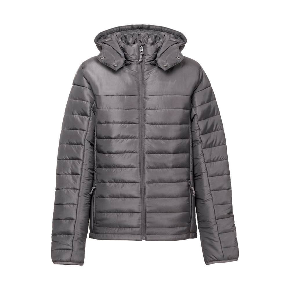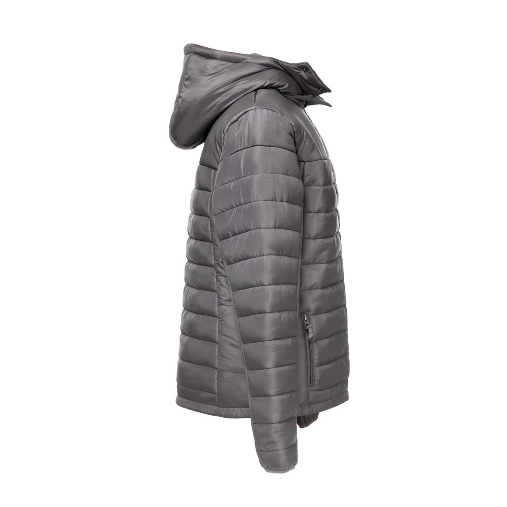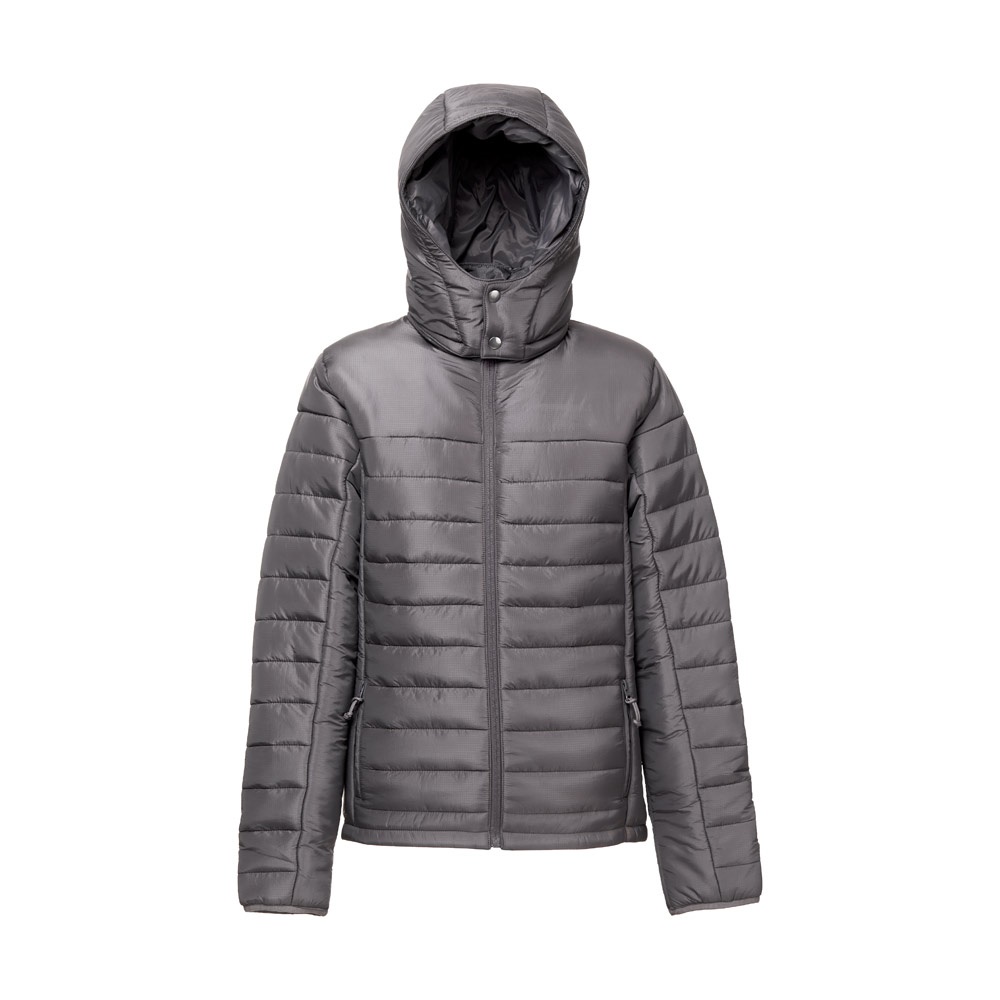 Damska kurtka z kapturem wykonana w 100% z nylonu ripstop z recyklingu (350 g/m²), wewnątrz podszyta w 100% nylonową taftą z recyklingu (350 g/m²) dla większego komfortu noszenia. Kaptur jest wyściełany i ma różne funkcje: elastyczną taśmę, dwa guziki zatrzaskowe i zamek błyskawiczny umożliwiający jego odpinanie. Z przodu zamek błyskawiczny YKK® – marki, która korzysta z nowoczesnego sprzętu o wysokiej jakości – i ściągacz. Posiada dwie przednie kieszenie z zamkami błyskawicznymi i ściągaczami oraz dwie wewnętrzne kieszenie z samoprzylepnymi zamkami błyskawicznymi. W dolnej części pleców znajduje się zapinany na zamek dostęp ułatwiający personalizację