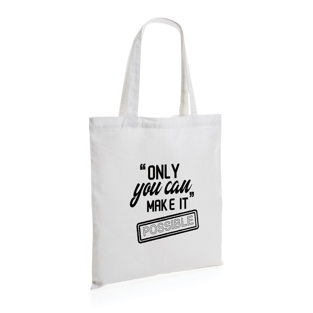 Torba na zakupy, wykonana z mieszanki 70% bawełny i 30% RPET o gramaturze 145 g/m2 pochodzących z recyklingu, dzięki zastosowaniu technologii AWARE™ wykorzystane materiały są identyfikowalne z pochodzenia, 2% wpływów z każdego sprzedanego produktu z kolekcji Impact jest przekazywane na rzecz Water.org