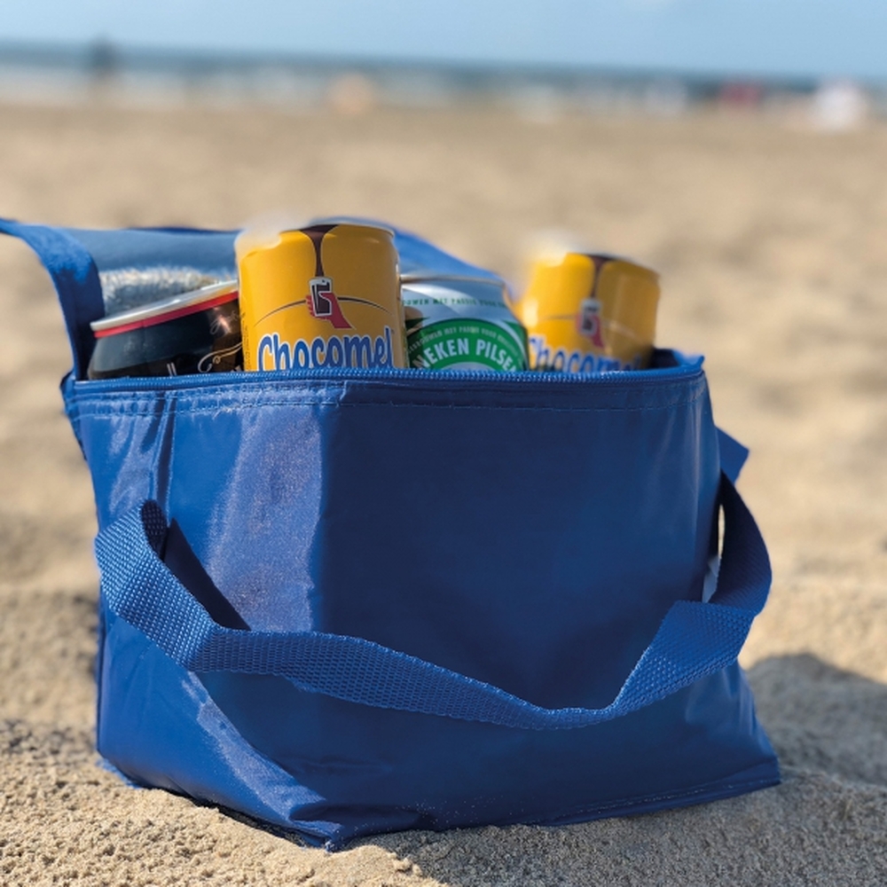 Poliestrowa torba-lodówka z praktycznym uchwytem, zapinana na zamek. Mieści 6 dużych puszek lub butelek o pojemności 500 ml.
