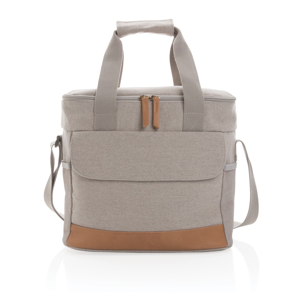 Torba termoizolacyjna, kieszeń z przodu oraz siateczkowe po bokach, pojemność torby do 20 puszek 0,33 l, detale z PU, wnętrze z PEVA, na zewnątrz płótno z recyklingu, dzięki zastosowaniu technologii śledzącej AWARE™ wykorzystane włókna są identyfikowalne z pochodzenia, 2% wpływów z każdego sprzedanego produktu z kolekcji Impact jest przekazywane na rzecz Water.org
