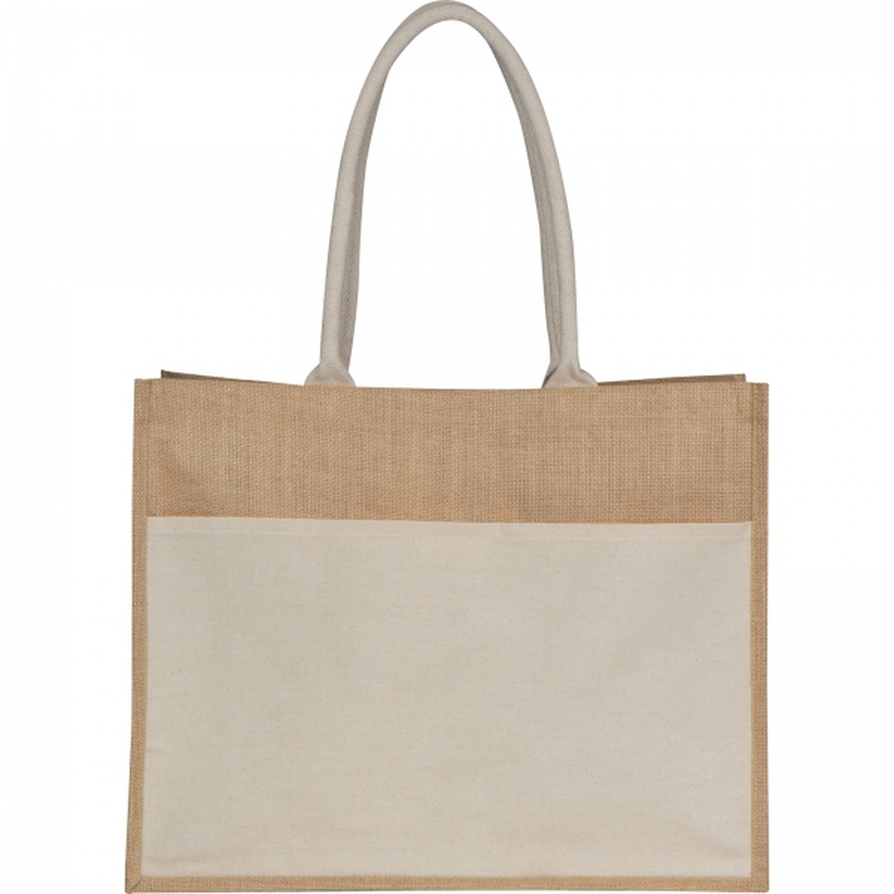 Torba z certyfikatem Oeko-Tex STANDARD 100, wykonana z juty, z bawełnianą wstawką z przodu torby umożliwiającą znakowanie i wytrzymałymi długimi uchwytami.