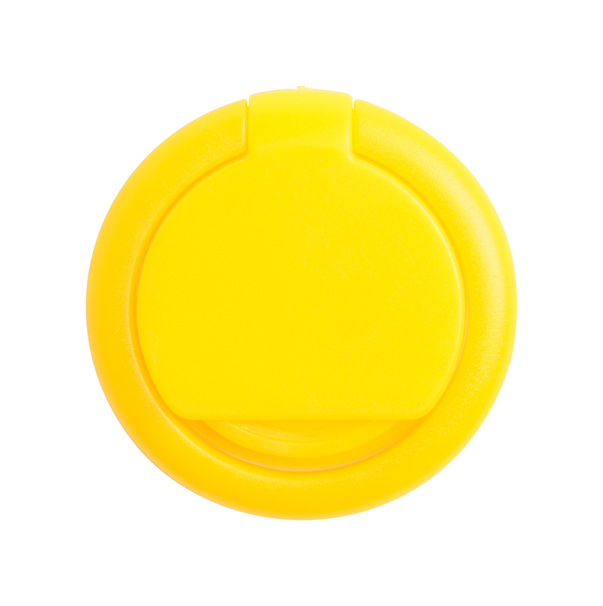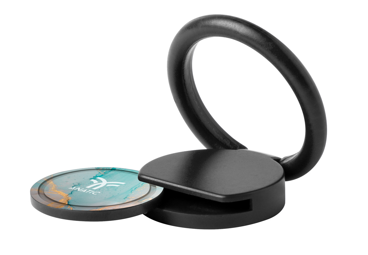 Okrągły, plastikowy uchwyt na telefon z samoprzylepną podstawą i żetonem do wózków na zakup.