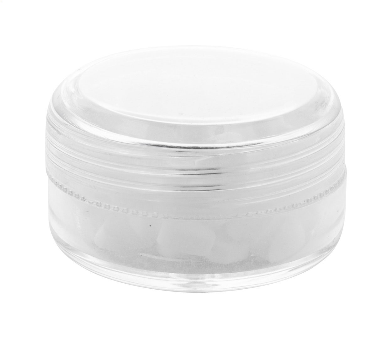 Okrągły, przezroczysty plastikowy słoik z kolorową zakrętką. Zawiera ok. 12 gramów cukierków miętowych.