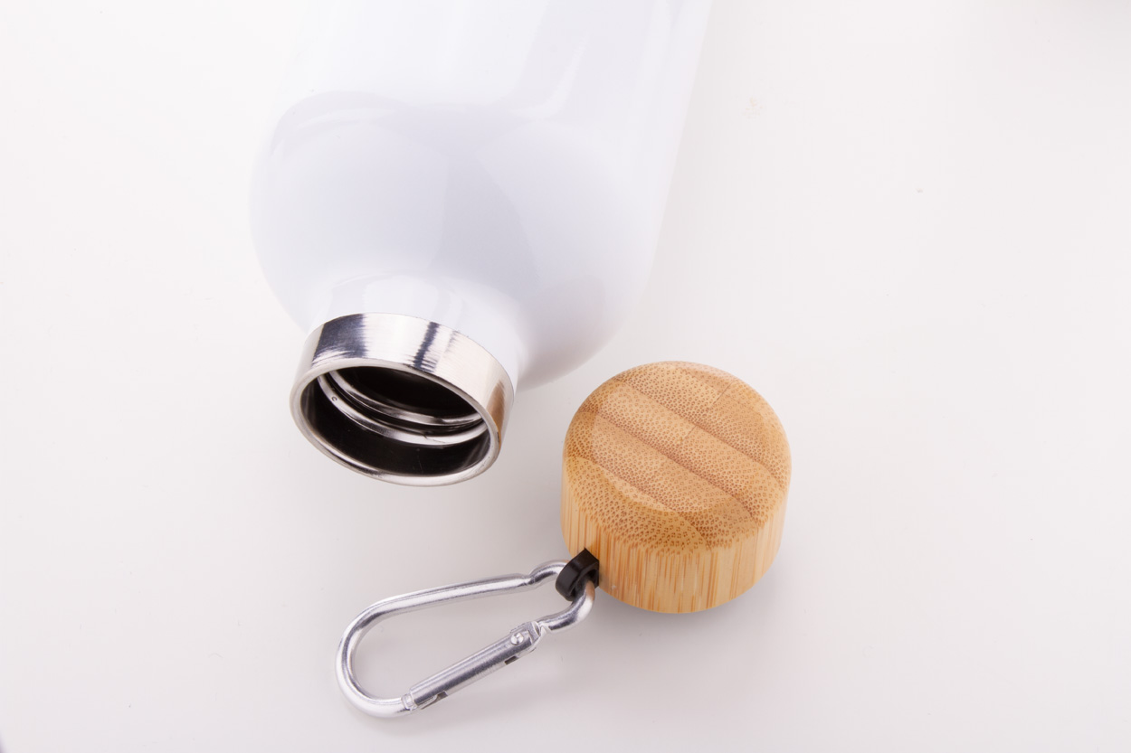 Butelka ze stali nierdzewnej o podwójnych ściankach, izolowana próżniowo, z bambusową nakrętką i karabińczykiem, 500 ml.