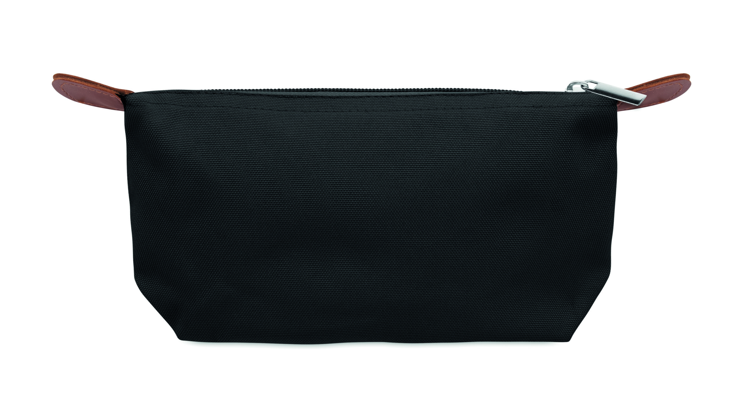 Kosmetyczka wykonana z poliestru 600D RPET z górnym zamkiem błyskawicznym i brązowymi detalami z PU.