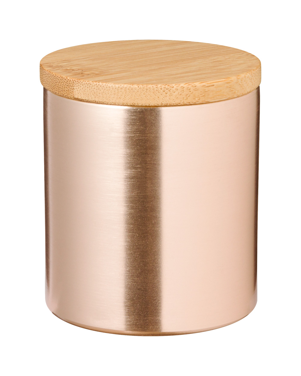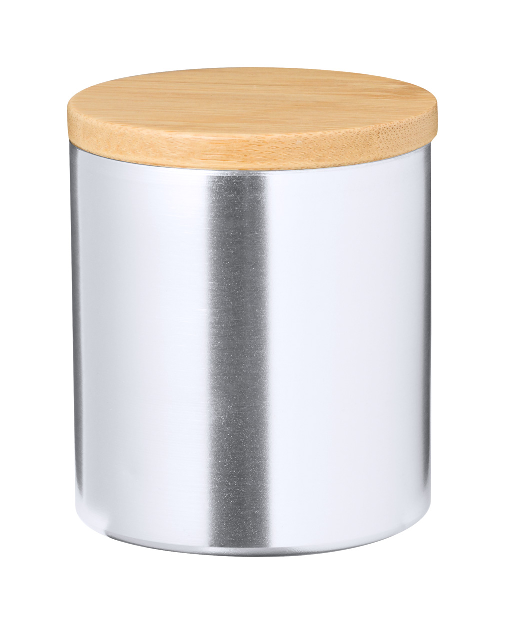 Świeca o zapachu wanilii w aluminiowym pojemniku z bambusową pokrywką.