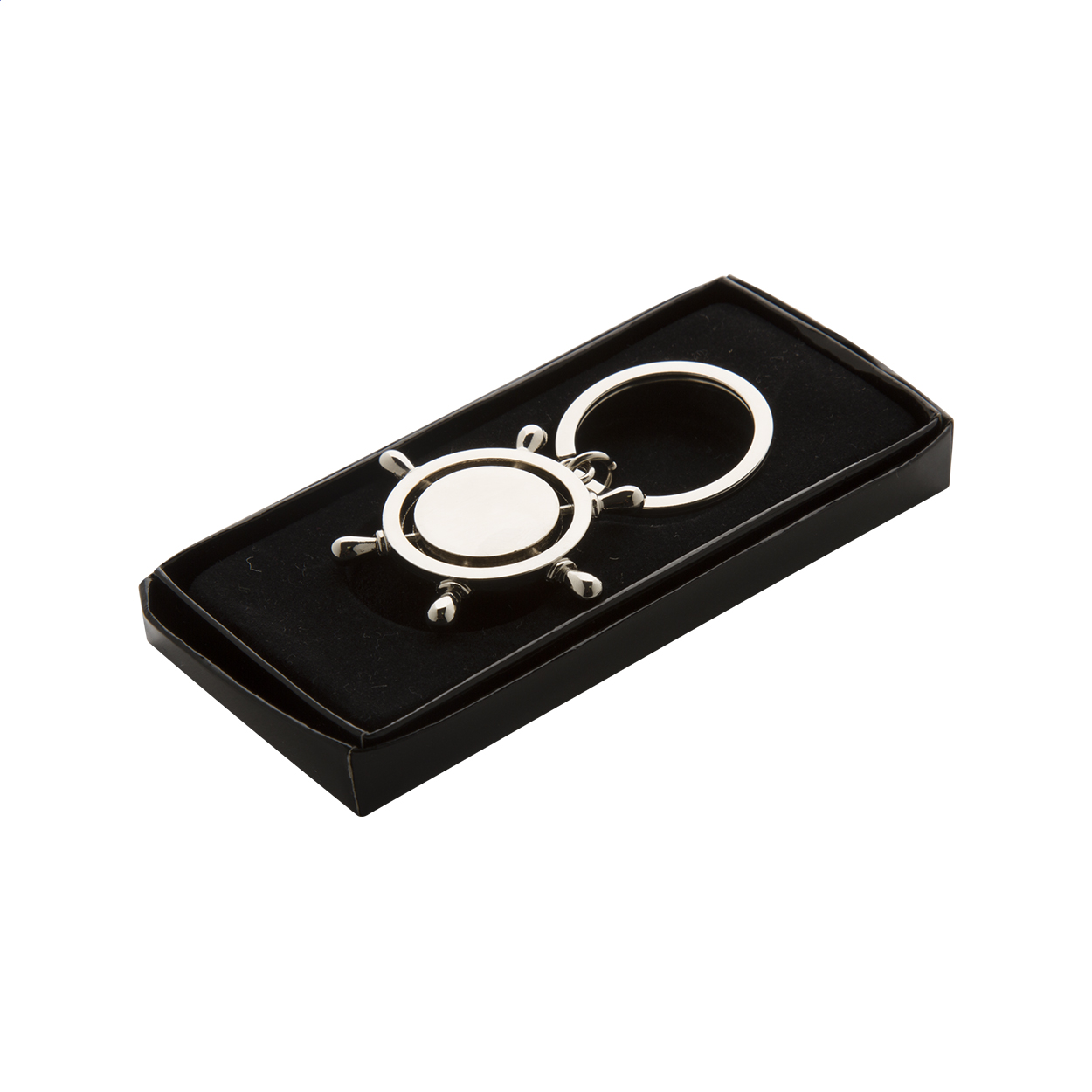 Brelok o kształcie koła sterowego w czarnym opakowaniu prezentowym.