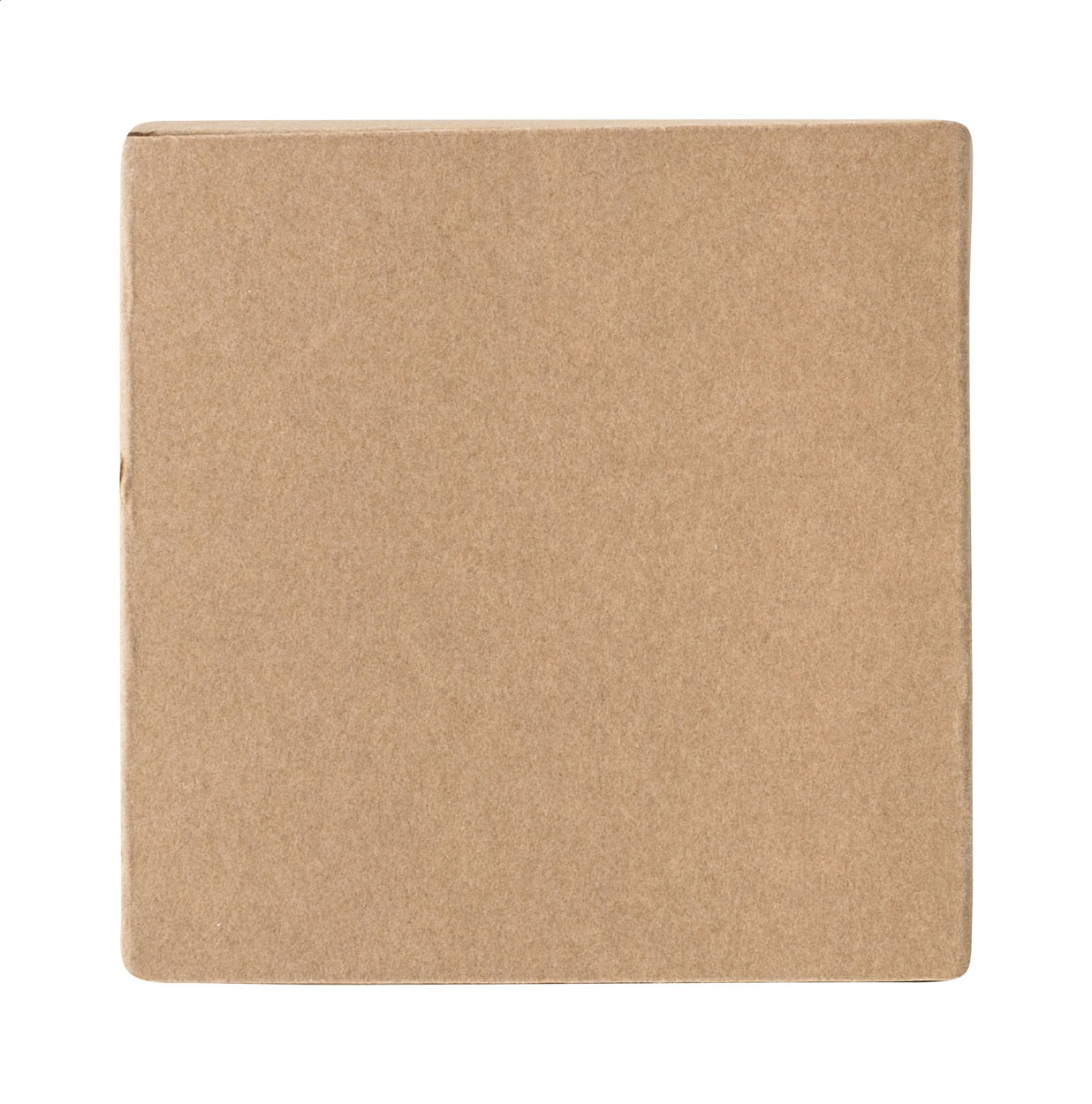 100 sztuk wykonanych na zamówienie kwadratowych wizytówek z obustronnym nadrukiem w pełnym kolorze. Matowy papier kraft, 300 g/m². W pudełku z papieru kraft.