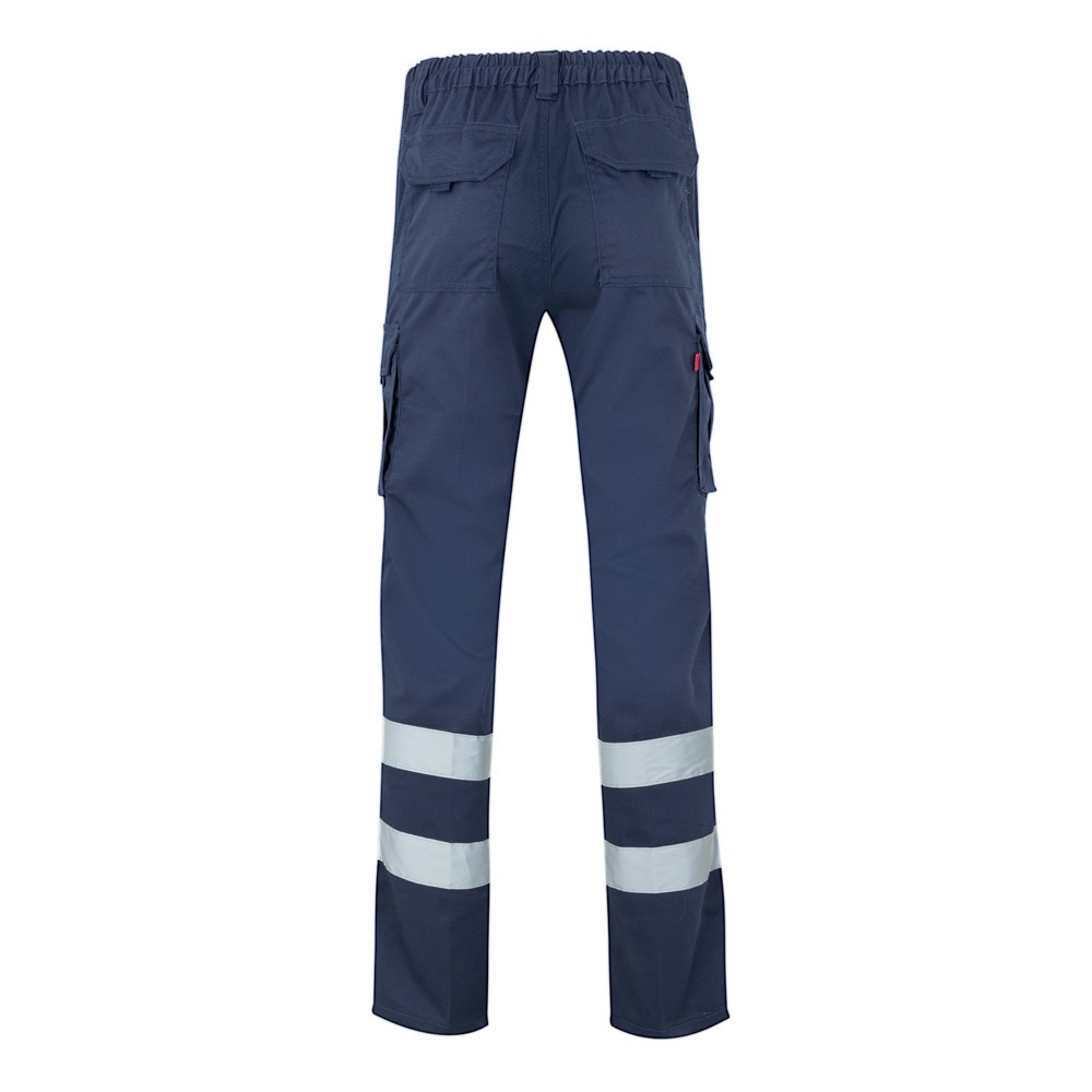 „Spodnie wielokieszeniowe ze stretchem (240g/m²), wykonane z bawełny (46%), EME (38%) i poliestru (16%). Elastyczny pas, odblaskowe paski na dole spodni i sześć kieszeni (2 francuskie, 2 boczne kieszenie mieszkowe i 2 tylne kieszenie mieszkowe). Produkt zgodny z rozporządzeniem UE 2016/425, certyfikowany przez EN17353 i klasę Nº B2