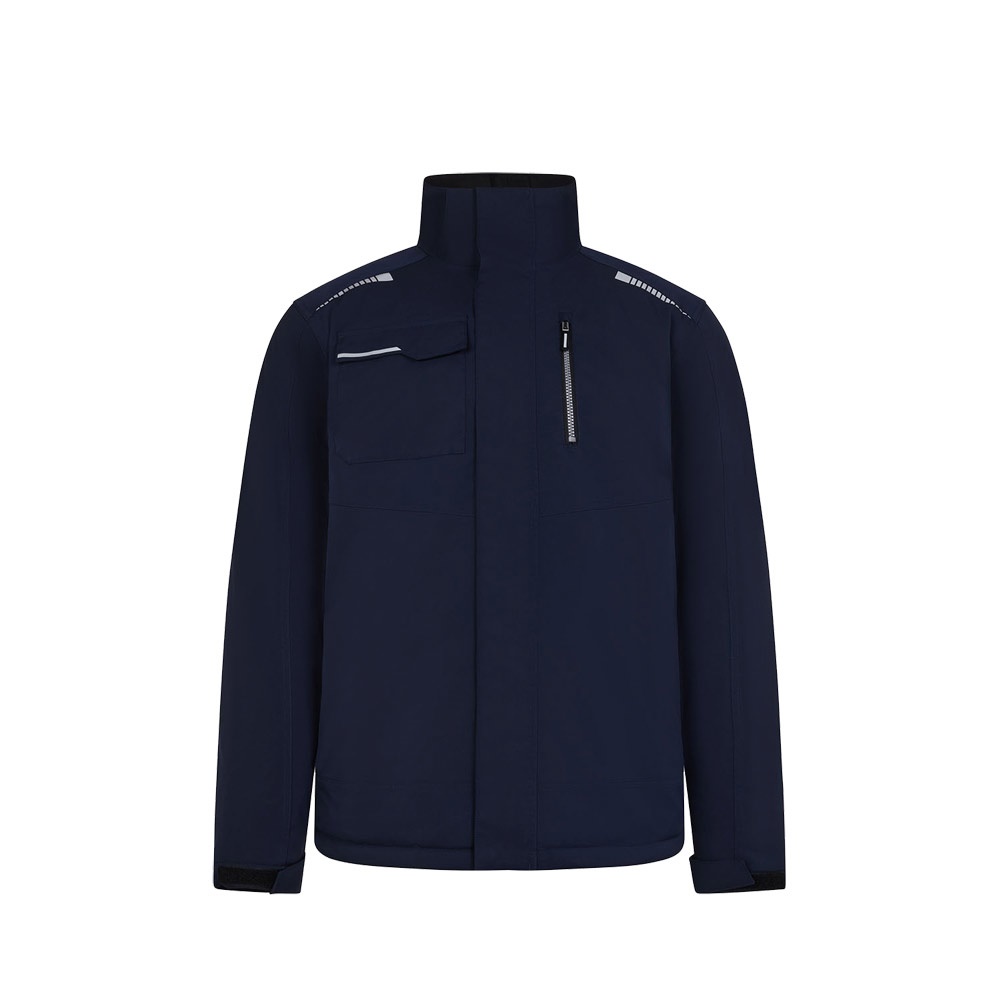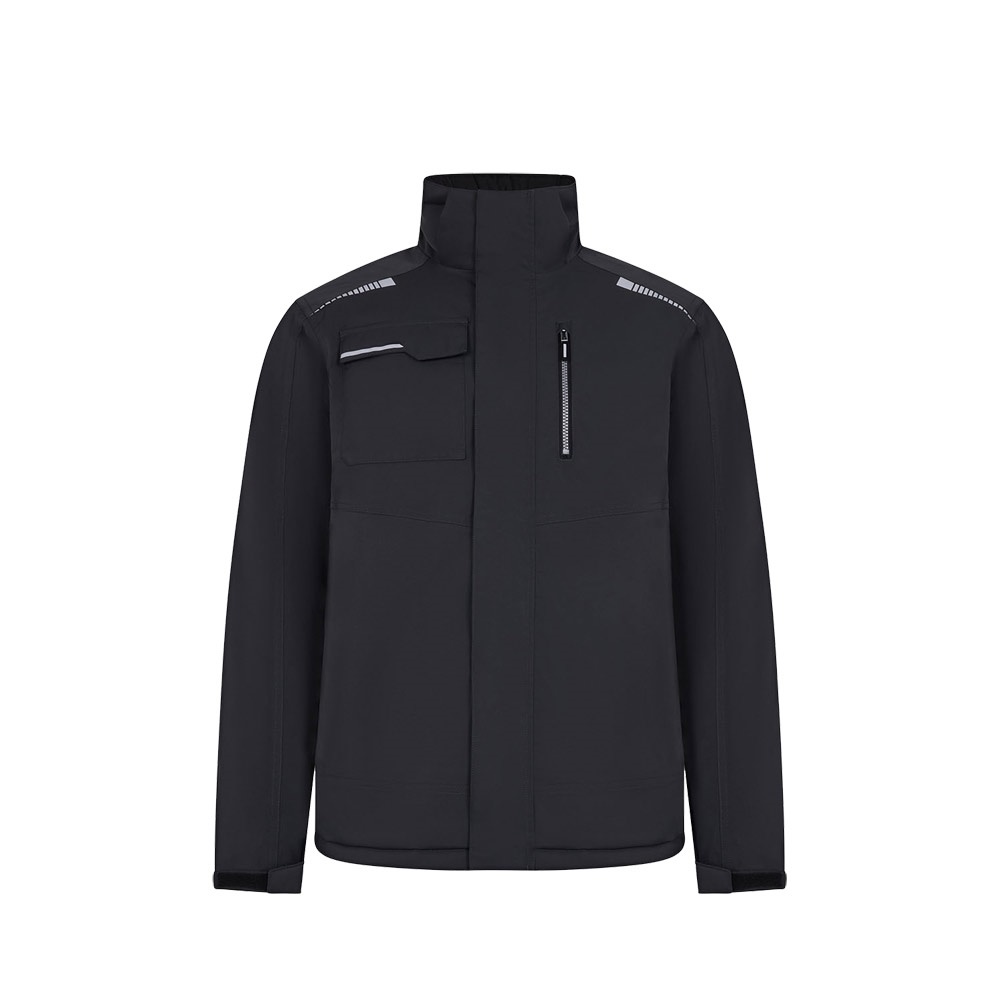 Kurtka pikowana (180 g/m²), wykonana z poliestru pochodzącego z recyklingu (50%) i poliestru (50%). Posiada wodoodporną elastyczną tkaninę, zgrzewane szwy, odblaskowe detale i centralne zapięcie na zamek błyskawiczny. Kurtka ma ukryte guziki i pięć kieszeni (dwie kieszenie boczne, jedną kieszeń na lewej piersi, jedną kieszeń na prawej piersi i jedną kieszeń wewnętrzną)