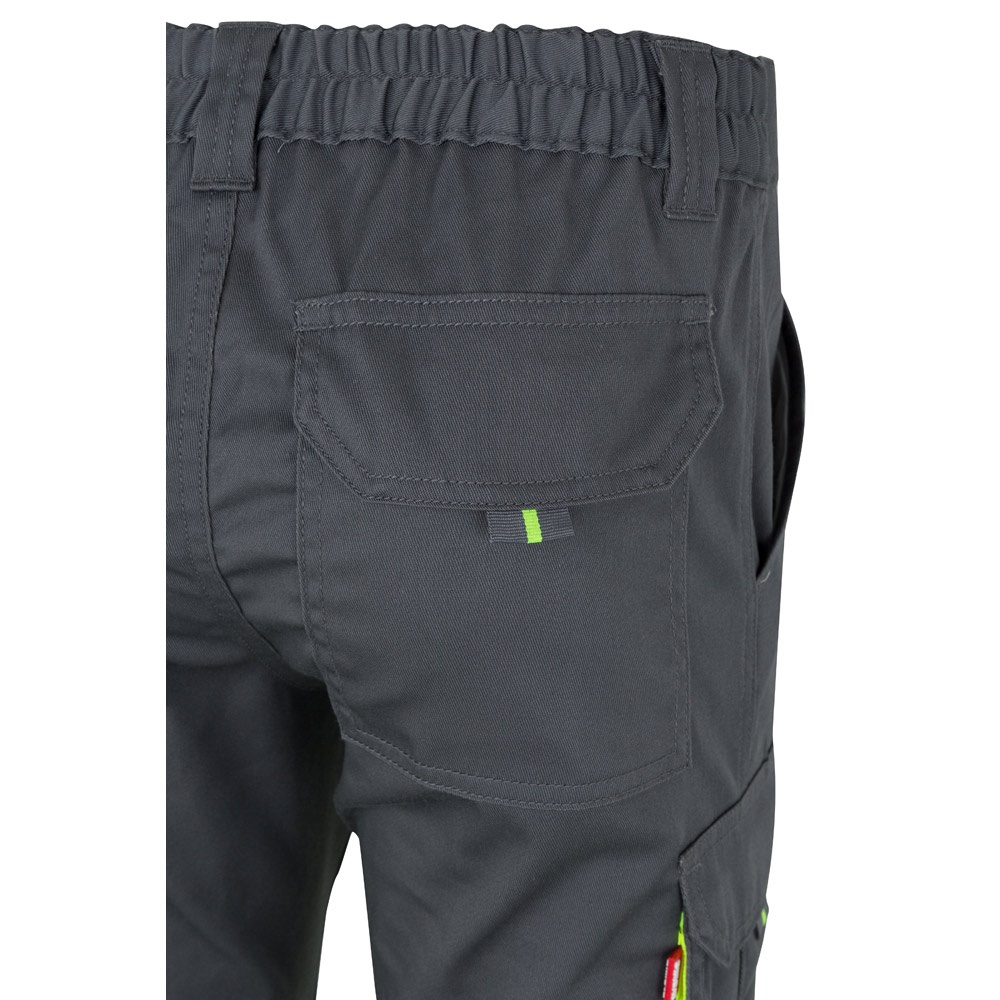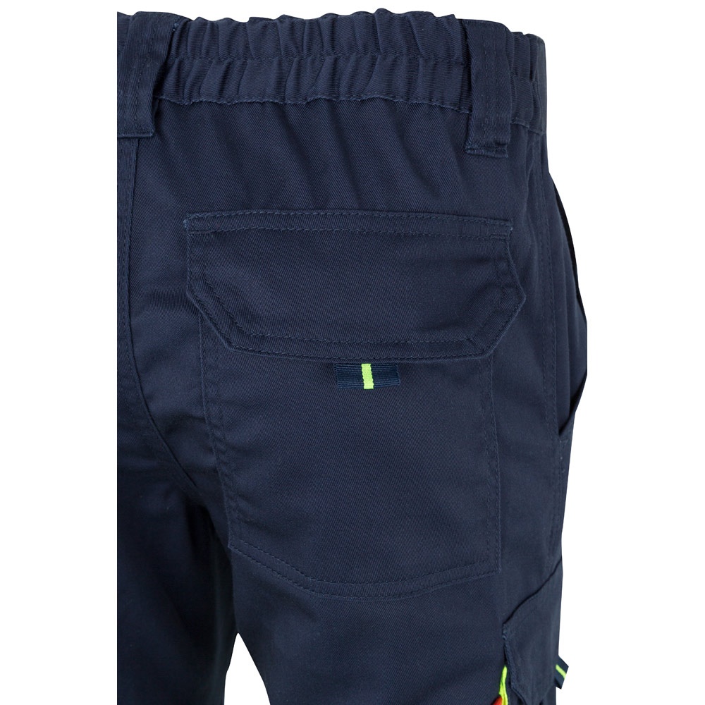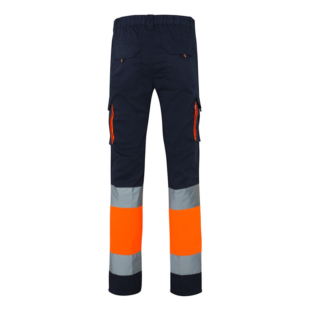 Dwukolorowe, elastyczne spodnie z wieloma kieszeniami (240g/m²), wykonane z bawełny (46%), EME (38%) i poliestru (16%). Z gumką w pasie i odblaskowymi paskami u dołu spodni. Kontrastowy kolor na miechach, ściągaczach i materiale pomiędzy paskami odblaskowymi. Sześć kieszeni (2 kieszenie francuskie, 2 boczne kieszenie mieszkowe i 2 tylne). Produkt zgodny z rozporządzeniem UE 2016/425, certyfikowany przez EN20471 i klasę Nº 1