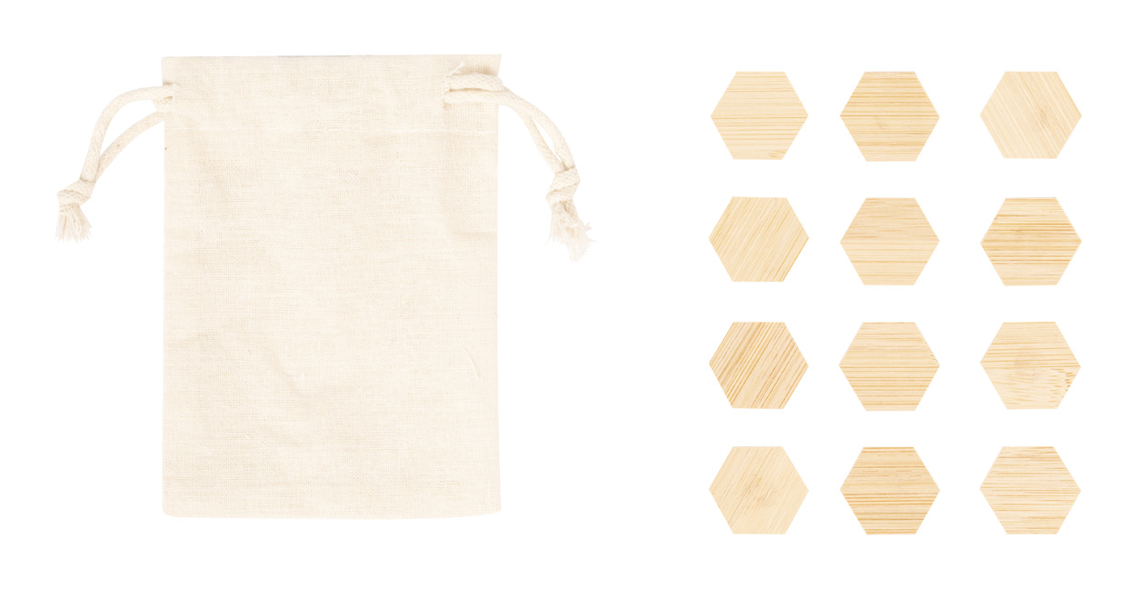 12-częściowy zestaw bambusowych magnesów na lodówkę, w bawełnianym etui ze sznurkiem.