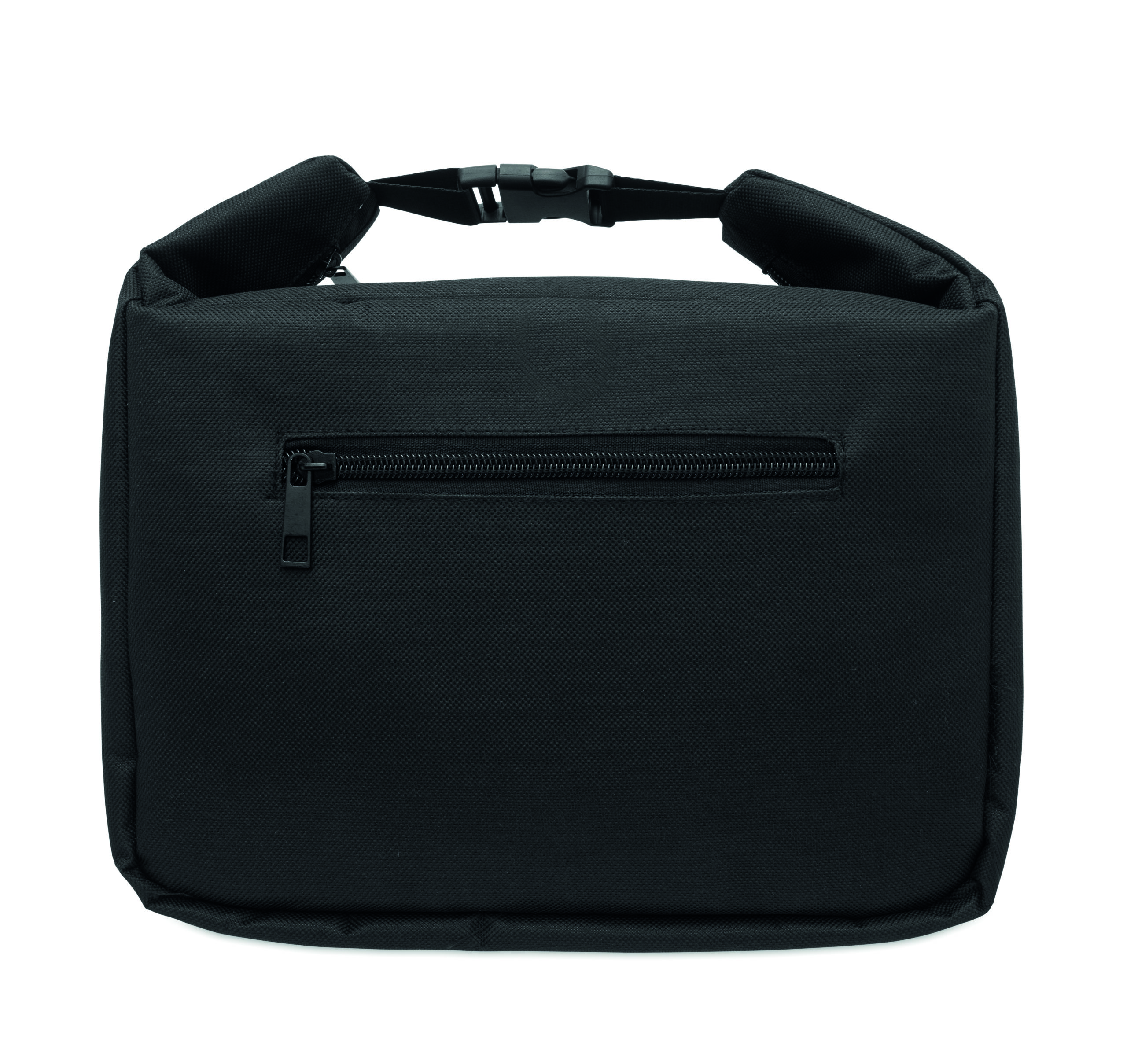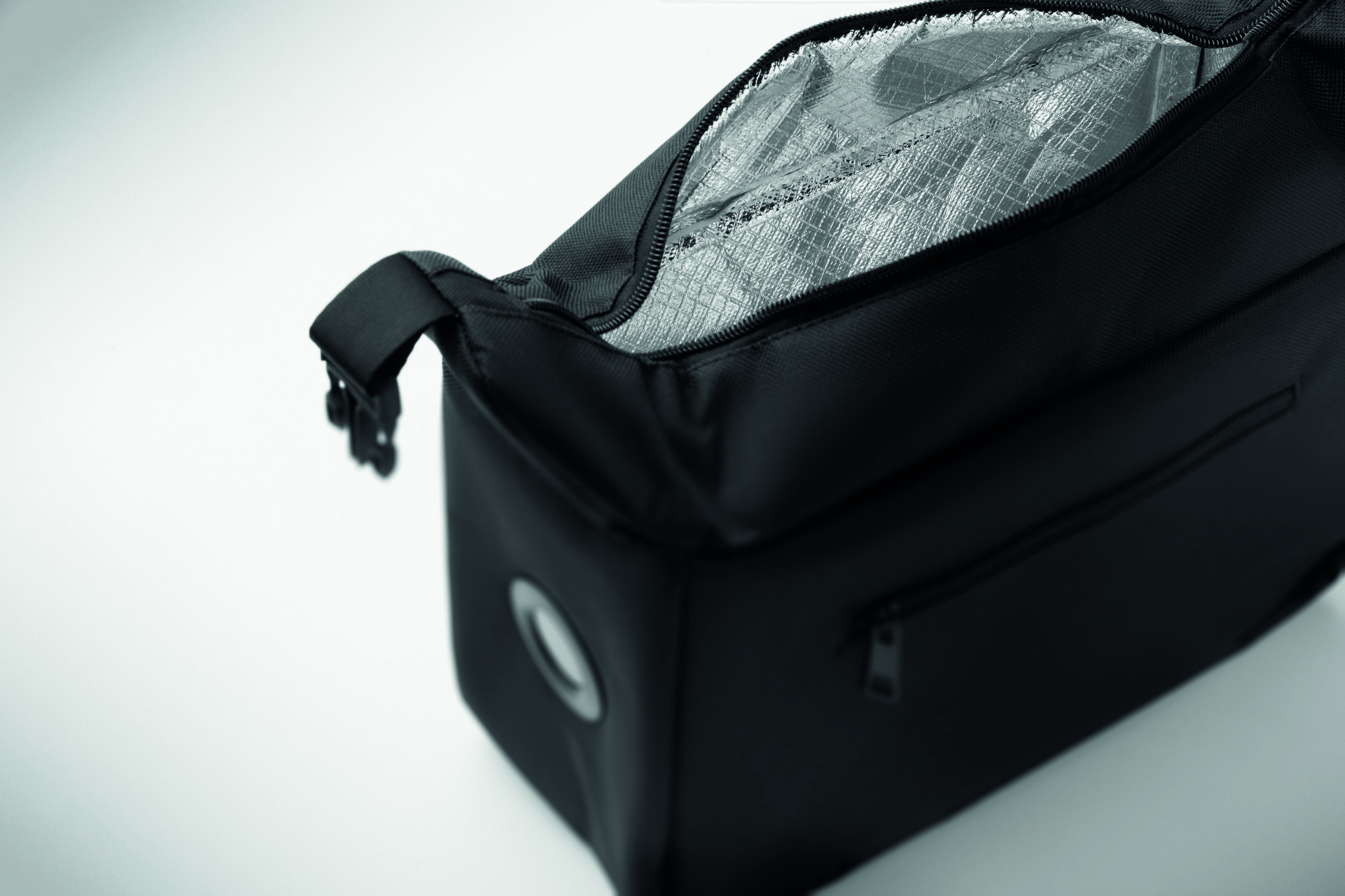 Torba termiczna ze wskaźnikiem temperatury z 600D RPET, pianką PE 3mm i podszewką z folii aluminiowej. Zapięcie na klamrę. Główna komora i boczna kieszeń zapinana na zamek błyskawiczny. Pojemność 5 L