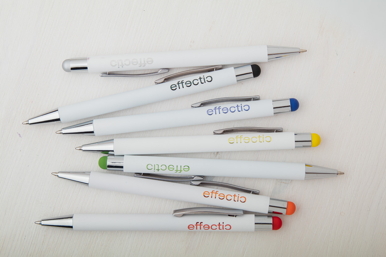Aluminiowy długopis z końcówką do ekranów dotykowych i powłoką pod kolorowy grawer. Niebieski wkład.