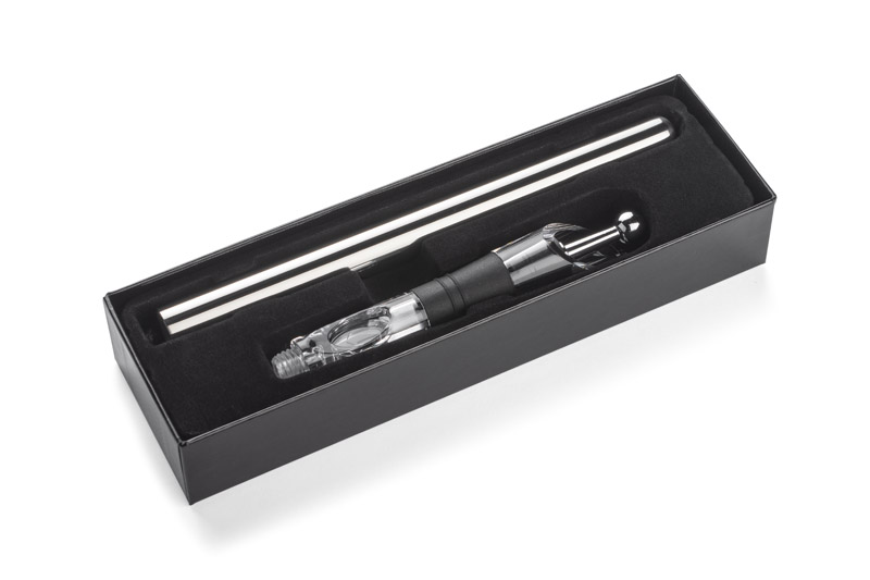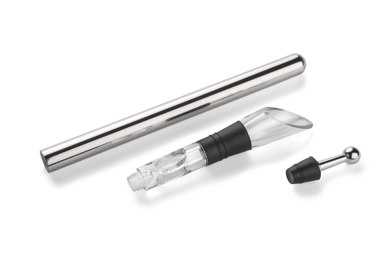 Prawdziwa gratka dla miłośników wina. Produkt skrywa wiele funkcji: utrzymuje odpowiednią temperaturę wina dzięki specjalnemu wkładowi chłodzącemu, napowietrza wino uwalniając jego aromaty dzięki ukrytemu w nalewaku aeratorowi, umożliwia zachowanie wszystkich aromatów w butelce poprzez zamykany korek. Odkręcany wkład chłodzący należy przed użyciem umieścić w zamrażalniku. Wszystkie elementy zapakowane w eleganckie czarne pudełko.