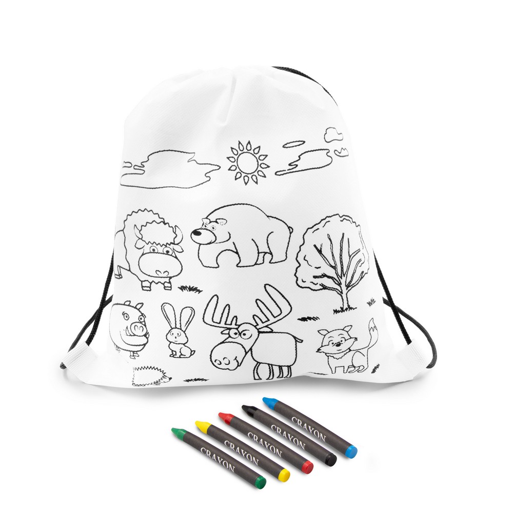 Worek ze sznurkiem umożliwiającym noszenie na plecach, kolorowanka z motywem zwierząt na froncie, 5 kredek świecowych w komplecie, produkt wykonany z materiału non-woven