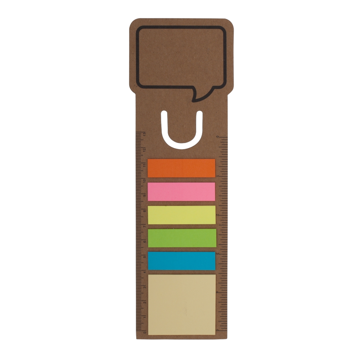 Zakładka do książek, która także może służyć jako linijka o długości 13 cm/5 cali. Zastosowano papier wykonany z surowców wtórnych o gramaturze 500 g/m2. Dołączone żółte karteczki samoprzylepne o gramaturze 75 g/m2 w ilości 15 szt. oraz 5 x 15 kolorowych karteczek memo o gramaturze 75 g/m2.