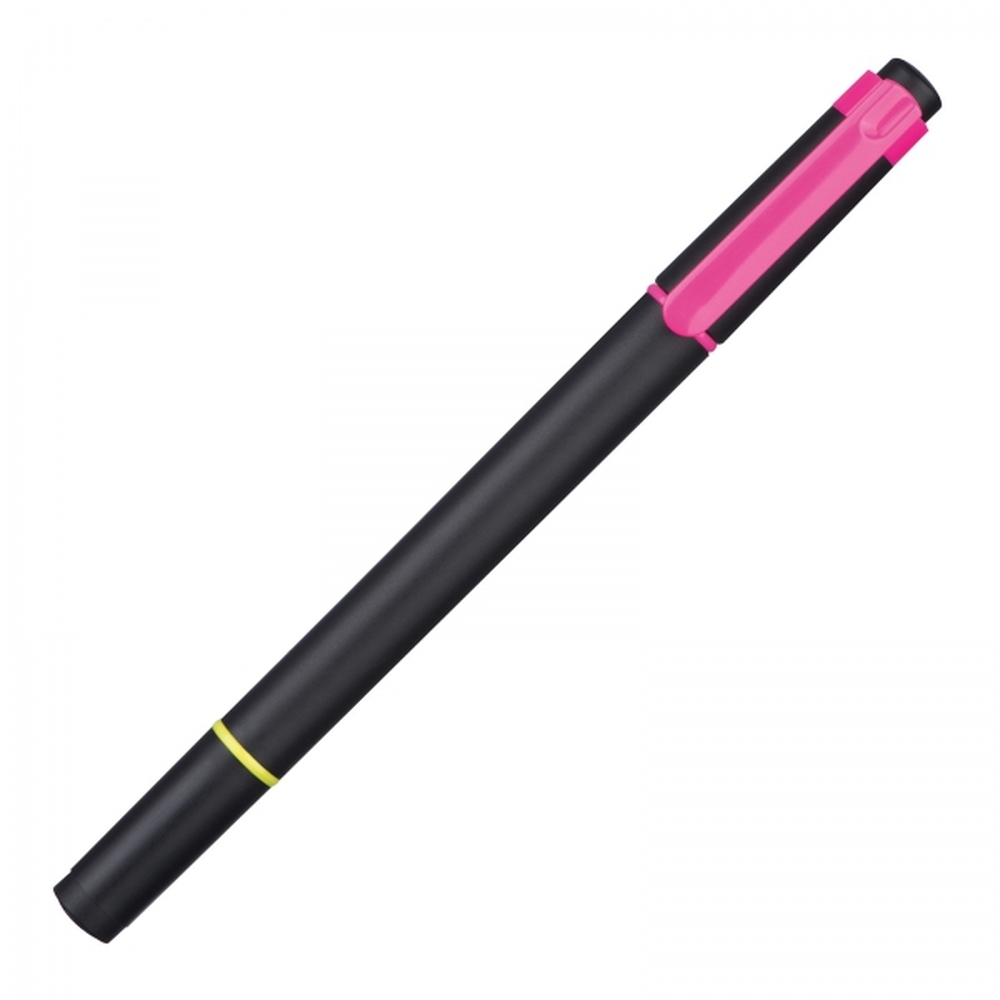 Plastikowy dwustronny zakreślacz w dwóch neonowych kolorach – różowym i żółtym.