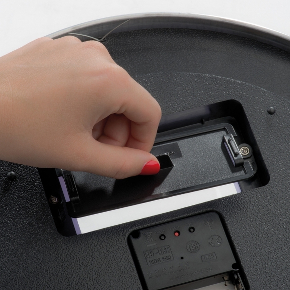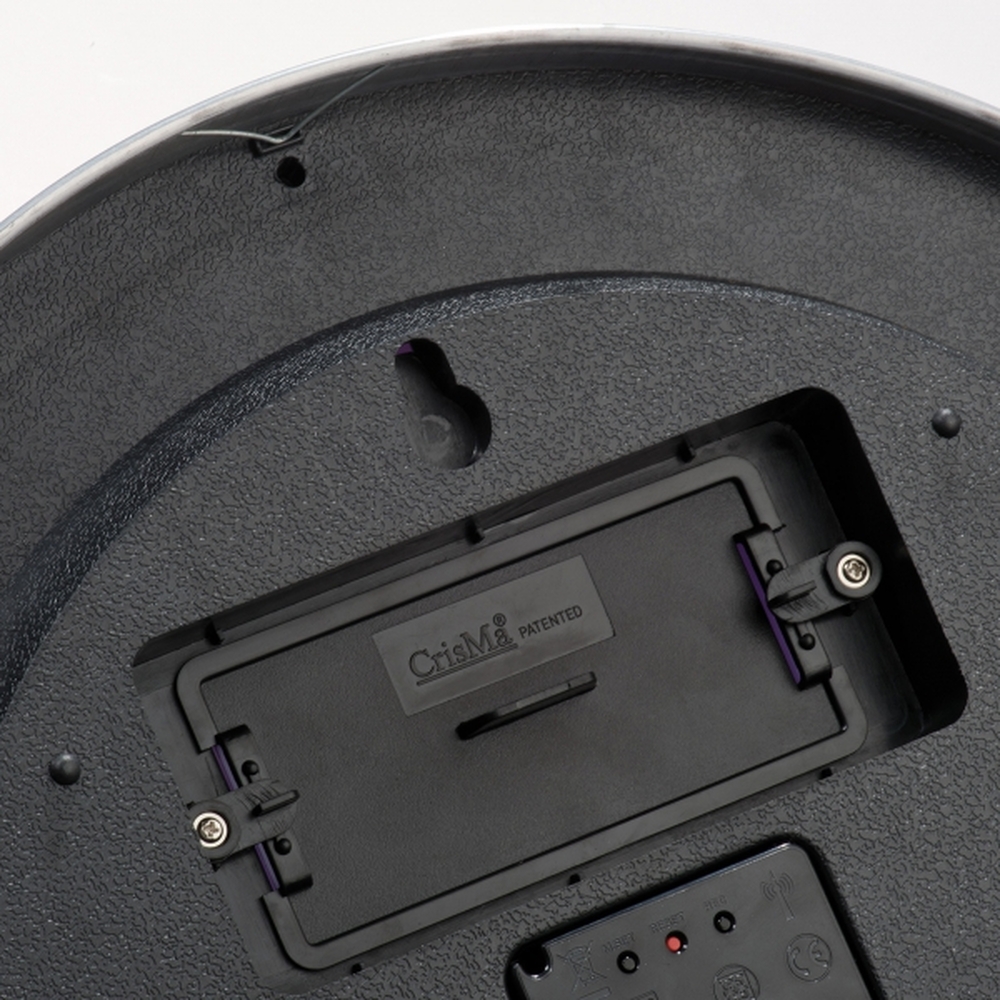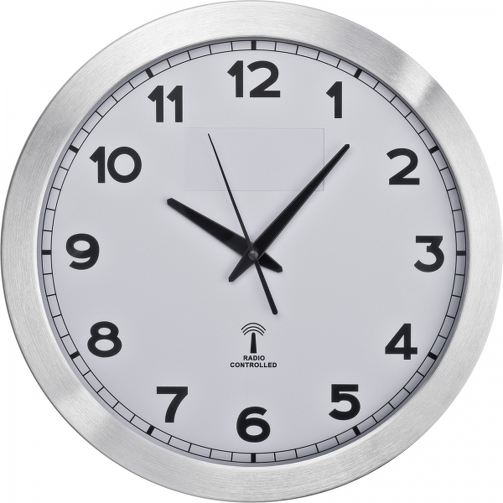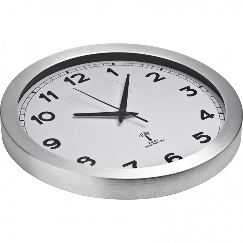 Duży zegar ścienny z metalu i szkła, sterowany radiowo. Zegar automatycznie ustawia godzinę – wystarczy włożyć baterie i nacisnąć przycisk reset.