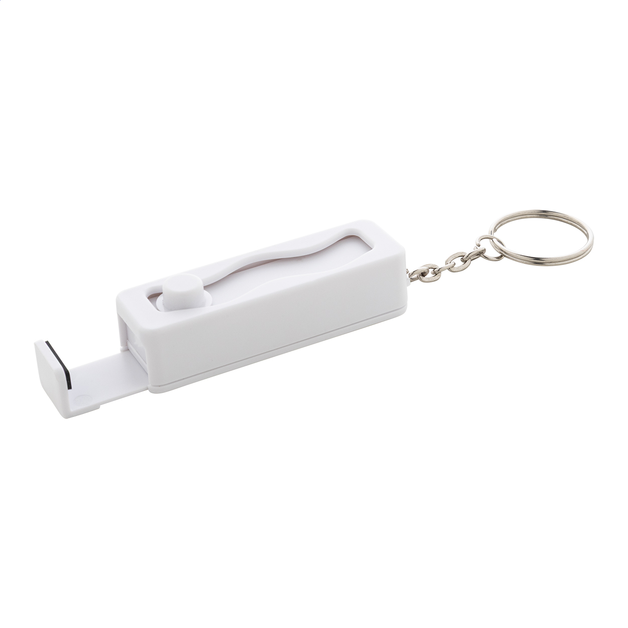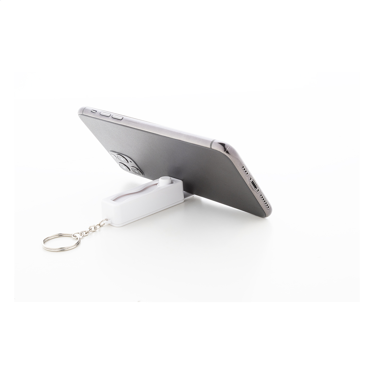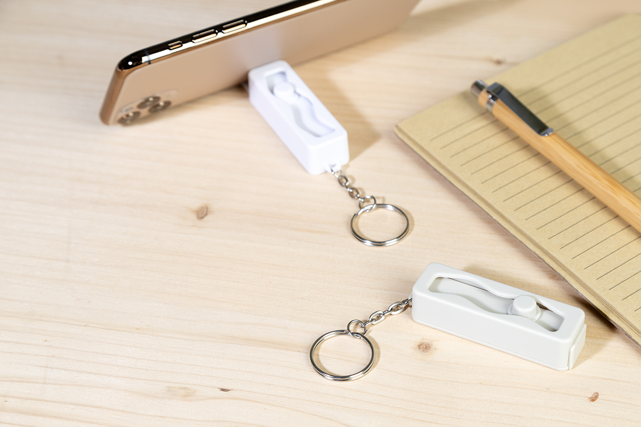 Brelok-zabawka antystresowa wykonana z recyklingowanego tworzywa ABS ze zintegrowanym uchwytem na telefon komórkowy i metalowym kółkiem.