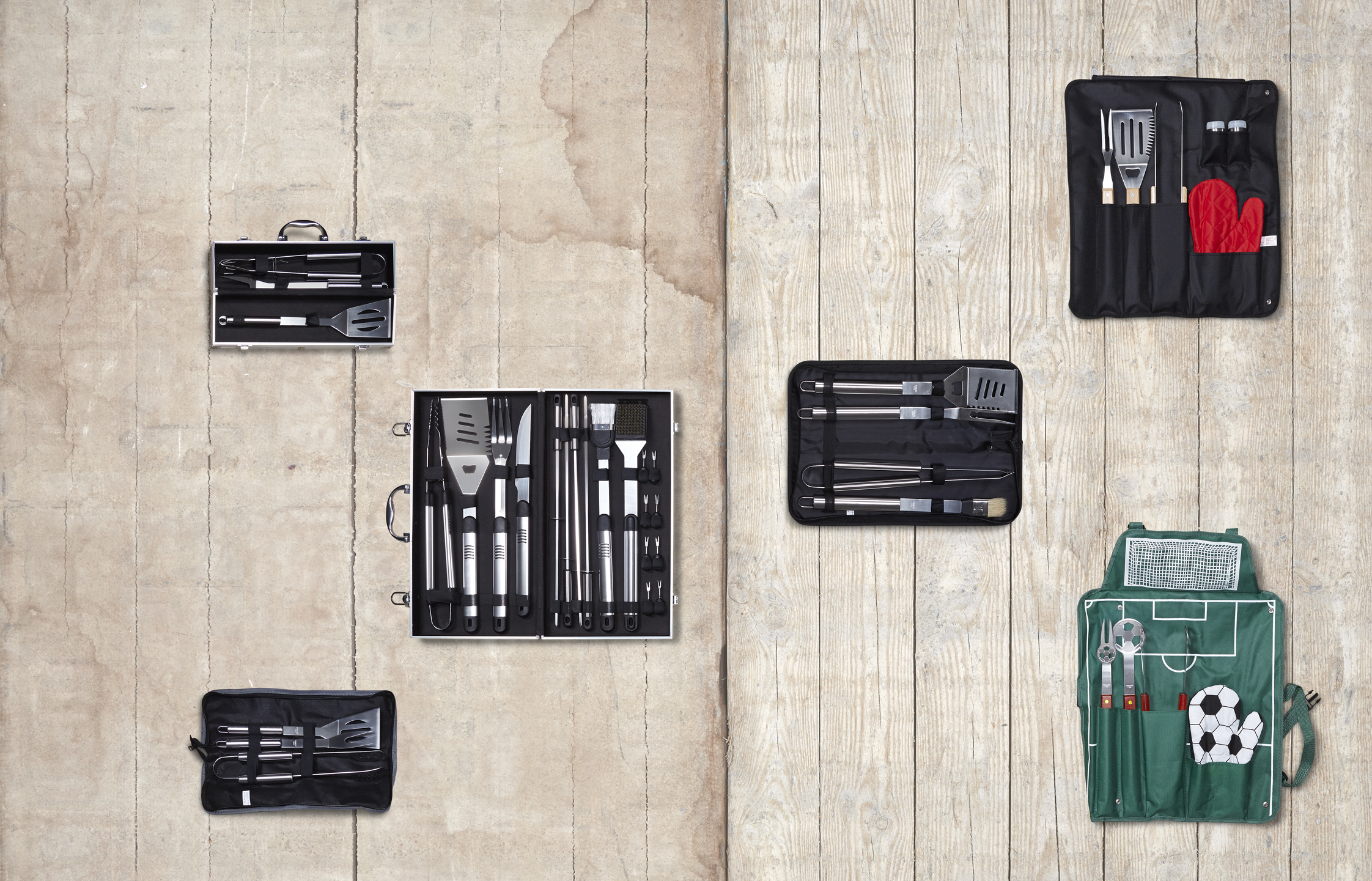 Zestaw do grilla w aluminiowej walizce, zawiera: 8 widelczyków, 4 szpikulce, pędzel, nóż do krojenia mięsa, widelec do mięsa, łopatka, nóż oraz szczypce