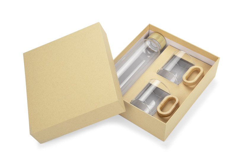 TRINKLA to gotowy zestaw upominkowy, który składa się ze szklanej butelki o pojemności 500 ml oraz dwóch szklanek 200 ml, zapakowanych w estetyczne, beżowe pudełko z zamknięciem. Butelka ma bambusową zakrętkę, a szklanki wyposażone są w oryginalne uchwyty z naturalnego bambusa. Harmonijne połączenie transparentnego szkła z detalami inspirowanymi naturą nadaje całości lekkości i nowoczesnego charakteru. TRINKLA sprawdzi się wszędzie tam, gdzie liczy się styl i funkcjonalność — w branży wellness, gastronomii, podczas eventów lub jako upominek dla partnerów biznesowych.