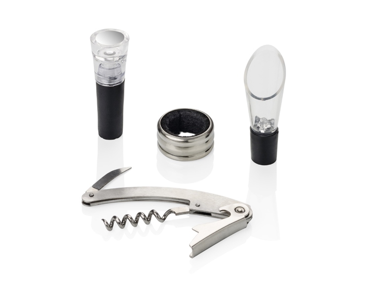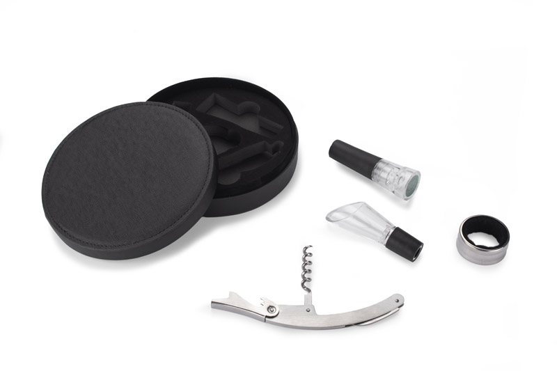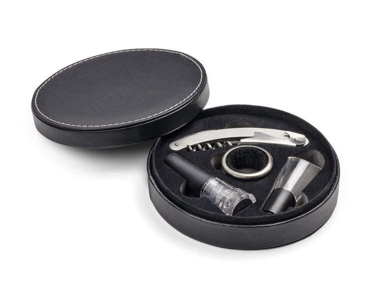 Elegancki czteroelementowy zestaw do wina pakowany w pudełko wykończone ekoskórą. W zestawie: próżniowy korek do wina, nalewak z funkcją aeratora, otwieracz i opaska na butelkę. Próżniowy korek z pompką zasysającą powietrze z butelki pozwala na dłuższe przechowywanie otwartego wina bez utraty cennych aromatów. Nalewak z funkcją aeratora napowietrza wino uwalniając jego aromaty.