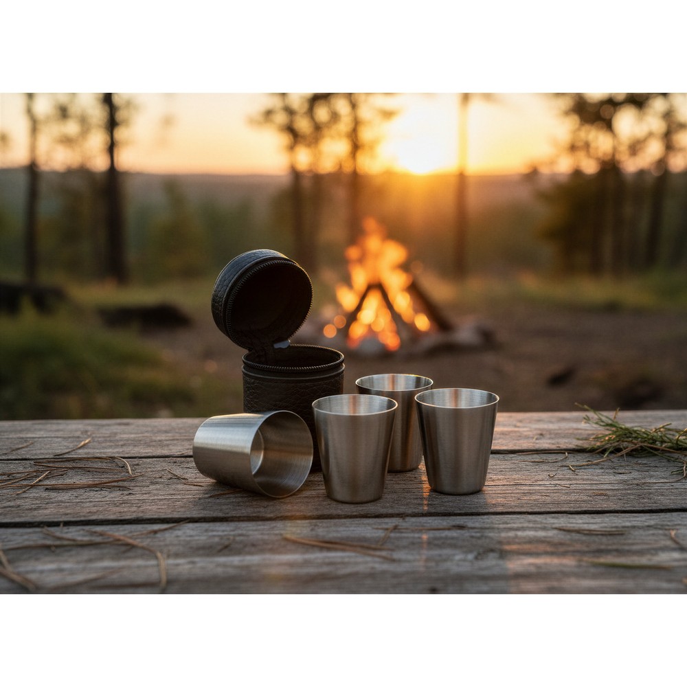 Zestaw 4 metalowych kieliszków 30 ml, zamykane na zamek etui wykonane ze skóry PU
